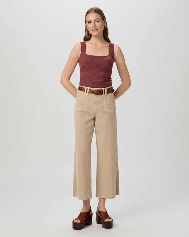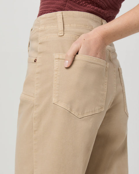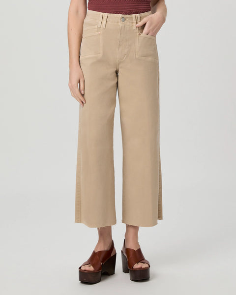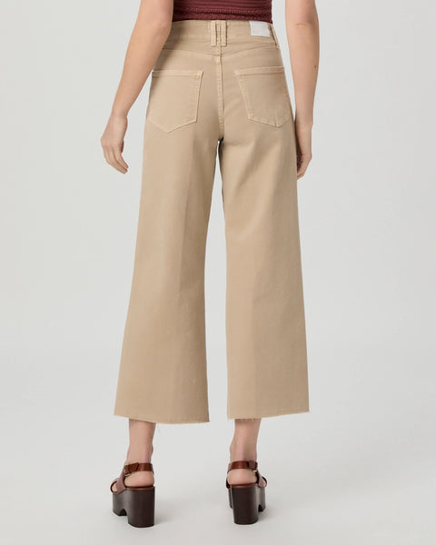 Anessa is Paige's modern high-rise wide leg with a slightly relaxed fit and an ankle length silhouette. This pair is crafted from  PAIGE VINTAGE denim in a vintage-inspired soft sand shade with set in pockets and a raw hem. PAIGE VINTAGE takes all of the work out of breaking in your favorite pair of vintage jeans. They've combined the comfort of stretch with everything you love about authentic vintage denim to create super soft jeans that feel perfectly lived-in from the very first wear. Sits at the natural waist. This fabric seamlessly blends comfort with everything you love about authentic denim to create super soft jeans that feel perfectly lived-in from the very first wear.