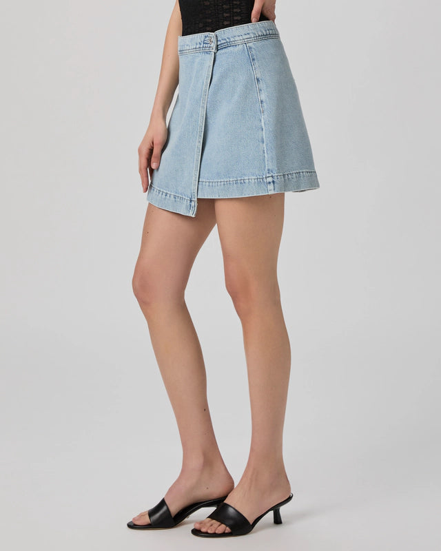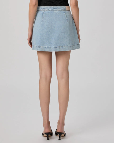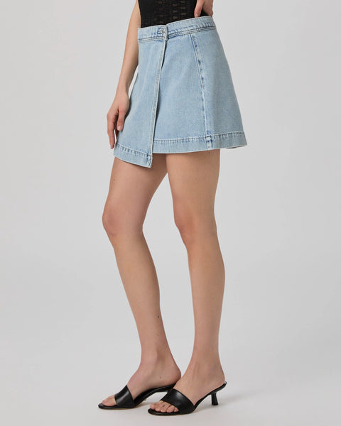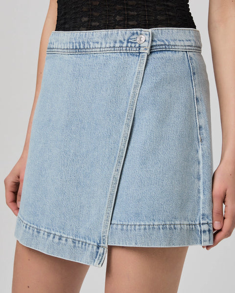 Crafted from the bestselling PAIGE VINTAGE denim, Aven is the must have mini skirt of the season. This super light wash denim skirt features a crossfront detail with a single button closure. PAIGE VINTAGE takes all of the work out of breaking in your favorite pair of vintage denim. Combining the comfort of stretch with authentic vintage denim, PAIGE creates a super soft jeans that feels perfectly lived-in from the very first wear.