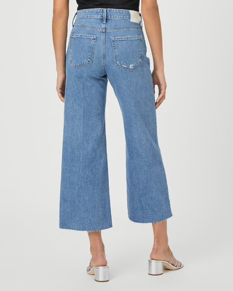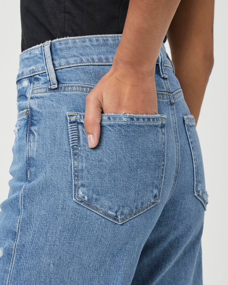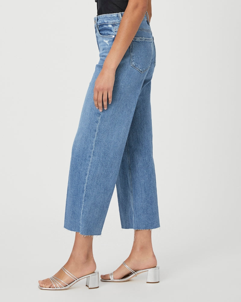 This modern ultra high-waisted wide leg has an easy, relaxed fit and an ankle length silhouette. This pair is crafted from PAIGE VINTAGE denim in a faded medium blue wash with lived-in distressing, seamed belt loops, and a raw hem. PAIGE VINTAGE takes all of the work out of breaking in your favorite pair of vintage jeans. Paige has combined the comfort of stretch with everything you love about rigid vintage denim to create super soft jeans that feel perfectly lived-in from the very first wear.