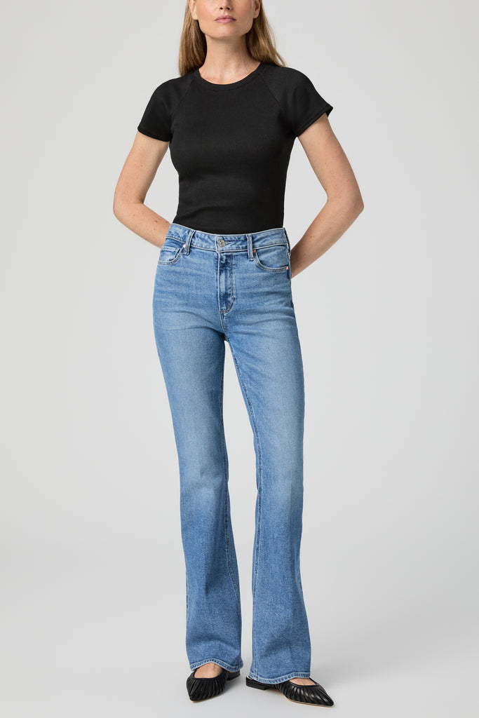 The High Rise Laurel Canyon is a vintage PAIGE style that has made a big comeback. Cut from TRANSCEND VINTAGE denim in a light vintage-inspired wash with marble texture, a raw hem and a 32" inseam, this classic bootcut silhouette combines the signature comfort of Transcend with rich denim character for a lived-in look.