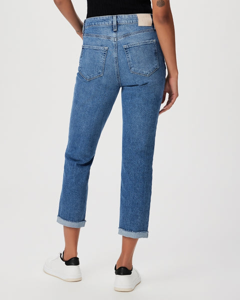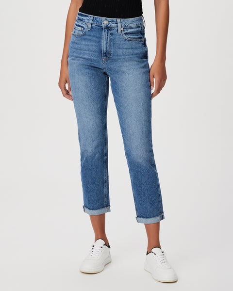 This high-rise tailored boyfriend jean gets a fresh update in a perfectly faded medium wash with a rolled, raw cuff hem that hits above the ankle. This pair is crafted from PAIGE Vintage denim which takes all of the work out of breaking in your favorite pair of vintage jeans. They have combined the comfort of stretch with everything you love about authentic vintage denim to create super soft jeans that feel perfectly lived-in from the very first wear.