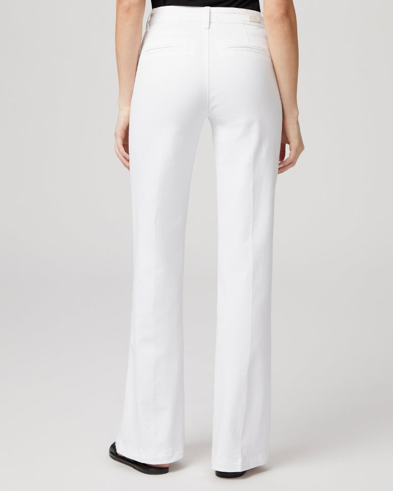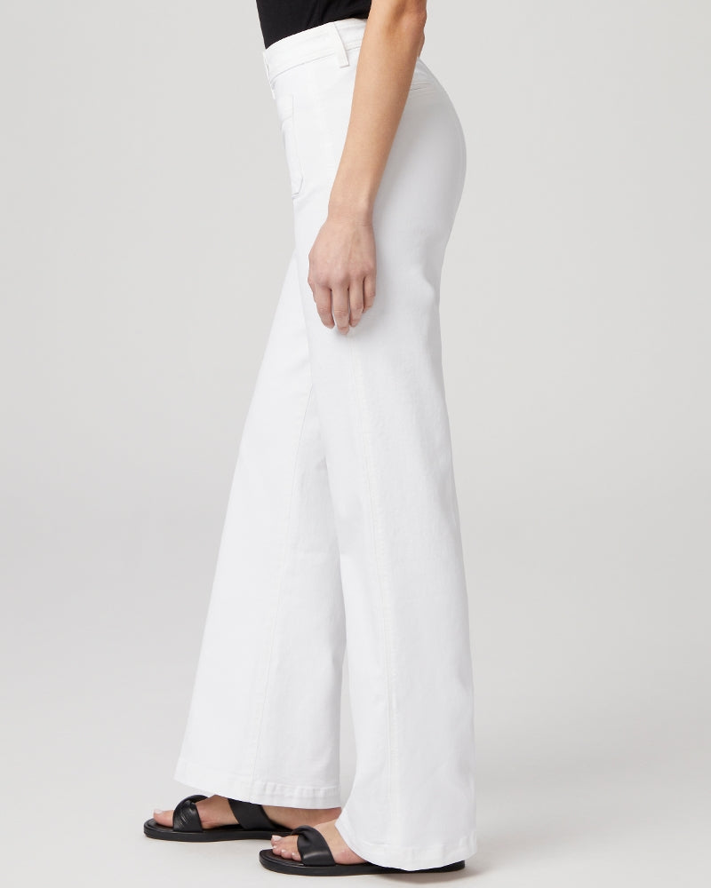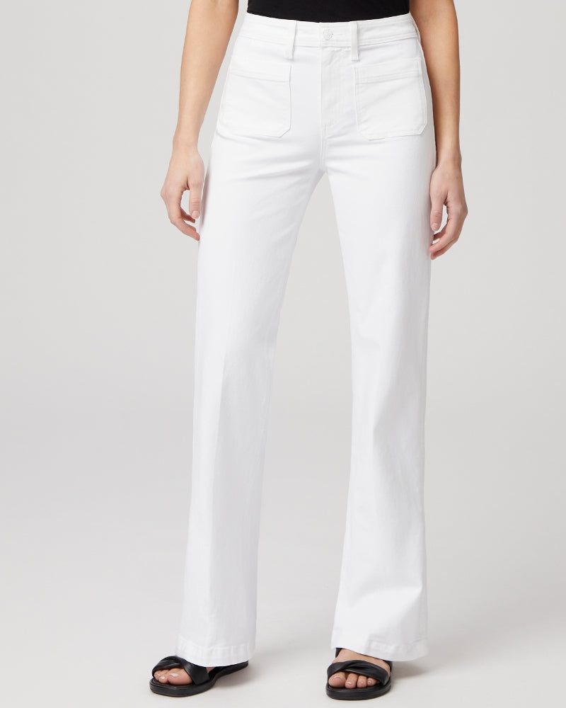 Crafted in comfort stretch white denim with a high-rise waist, this wide leg reflects the sailor styling trend that we've been seeing on the runway with front patch pockets. This long and lean silhouette is ultra chic in crisp white, finished with clean faux welt pockets in the back. The 32" inseam pairs perfectly with flats and also works well for petite customers looking to style it with a heel.