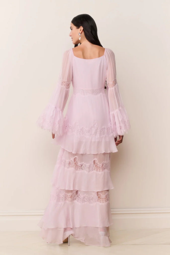 The Devina Dress is a show-stopping, bohemian-inspired maxi designed from lightweight silk chiffon. Inspired by ’70s silhouettes, it features a deep V-neckline, bell sleeves with elastic at the shoulders, and a high-to-low tiered skirt that flows beautifully with every step. Perfect for warm-weather occasions or vacation evenings, Devina embodies effortless, romantic glamour.
