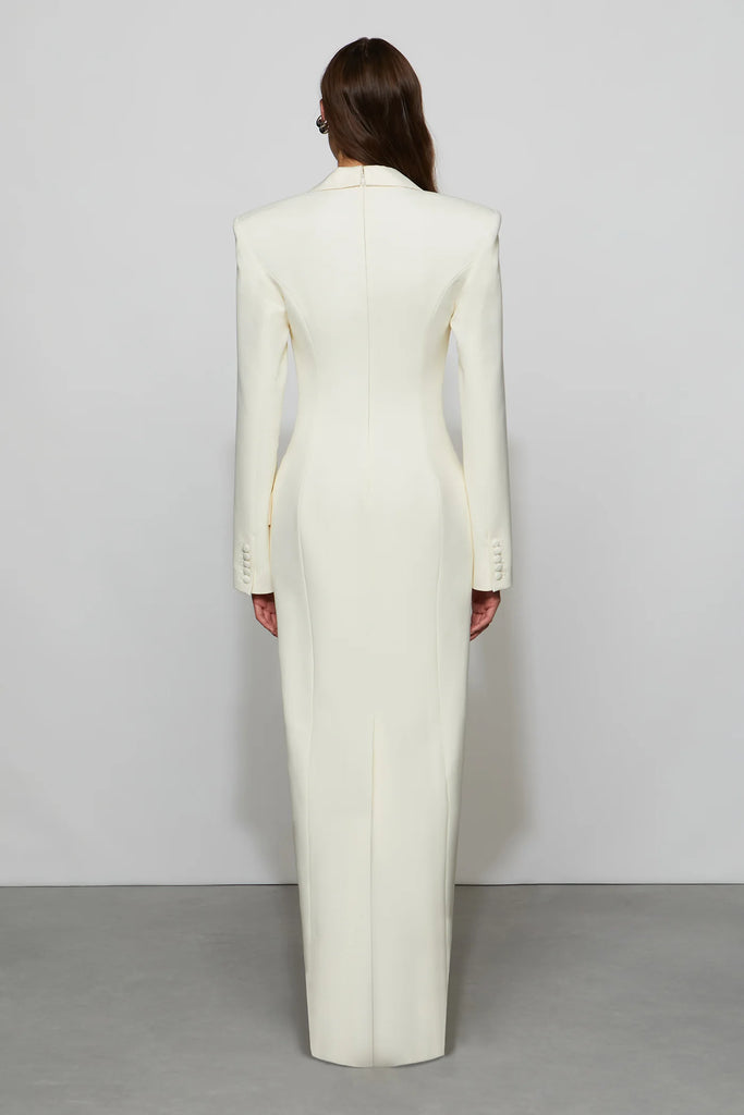 Plunging column gown with a continuous lapel and sculpted shoulders. Features a fixed modular deep-V neckline and clean faux pockets. Composition: 72% Polyester, 15% Rayon, 3% Wool, 3% Cupro, 3% Acetate, 4% Spandex