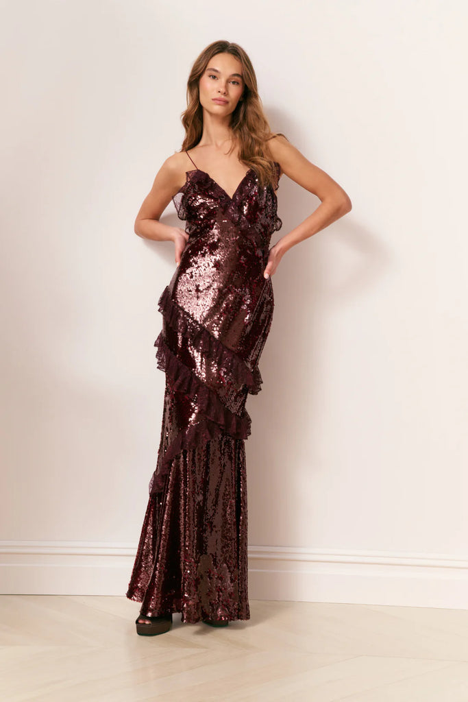 The iconic Rialto Dress returns in show-stopping glimmer—now fully reimagined in a shimmering sequin fabric in a rich, wine-deep hue. The silhouette remains beautifully familiar: a slightly fitted bodice with a hidden side-seam zipper, ensuring it flatters in all the right ways. But this special edition is sprinkled with new intrigue—delicate lace ruffles are striped throughout, weaving romance into every shimmer. A statement-making piece, made for unforgettable nights.