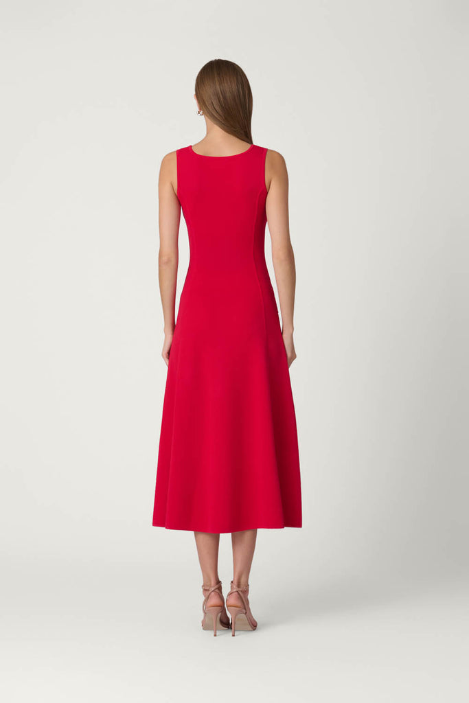 Knit midi dress adorned with metallic gold buttons. This dress is fitted through the body, and the skirt flares out. The front placket and pocket details are non-functional. Pulls over the head. Unlined.