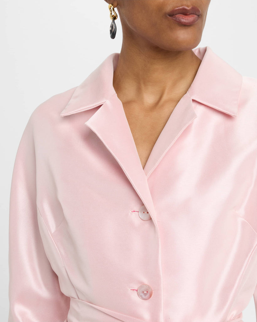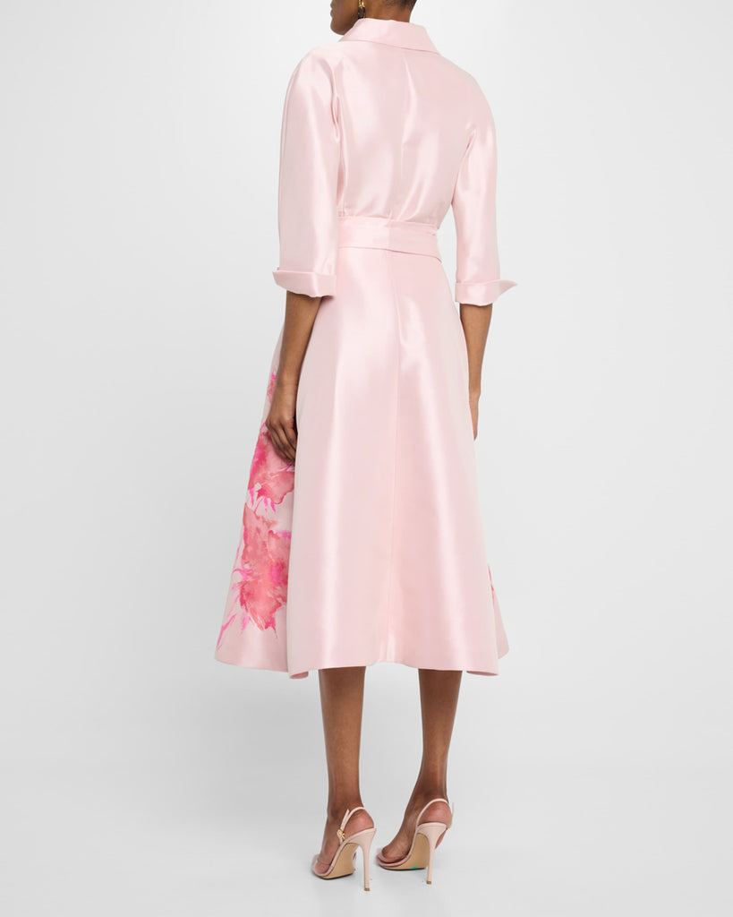 This floral print shirt dress in Blush Multi is a stylish blend of sophistication and femininity. Made from structured Mikado fabric, it features a button-down front, a classic collared neckline, and a waist-defining tie belt for a polished look. The soft pink base is complemented by a vibrant floral border print, while the midi-length A line skirt adds elegance and ease of movement. Perfect for luncheons, daytime events, or weddings, this dress is a timeless wardrobe staple.