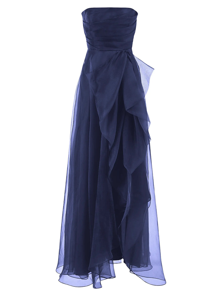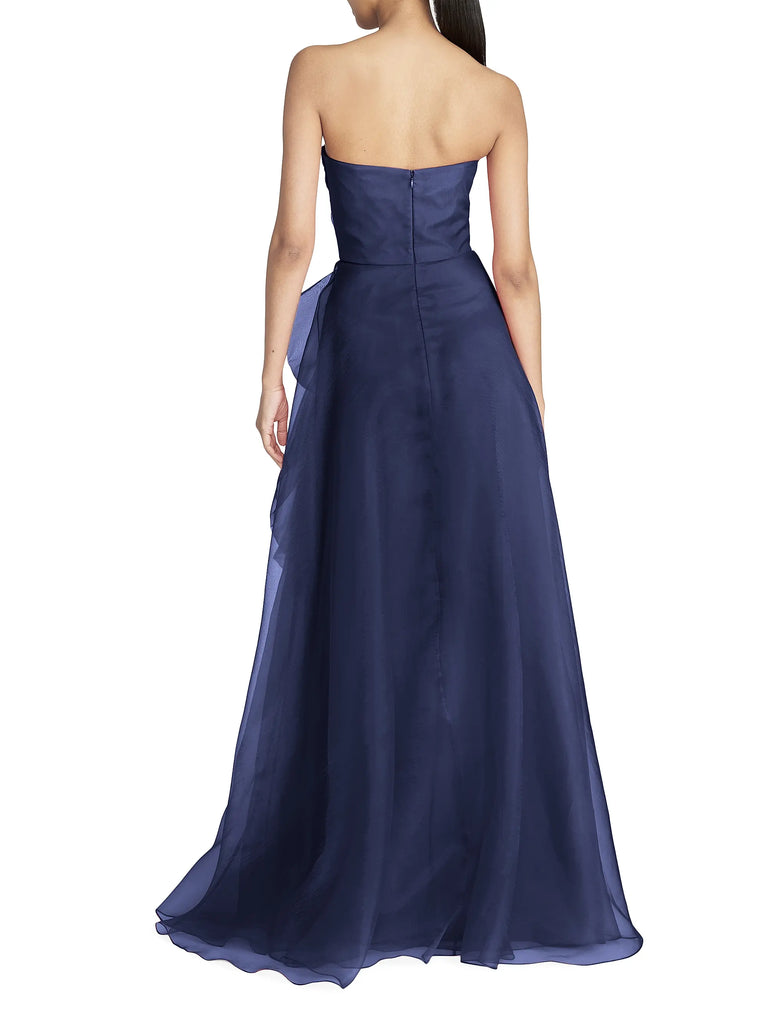 Lustrous Mikado gown in navy lavender, designed with a draped strap neckline and sculptural overlay skirt atop a column base.