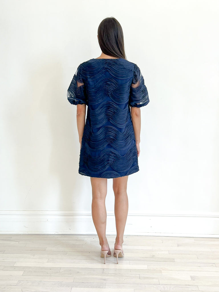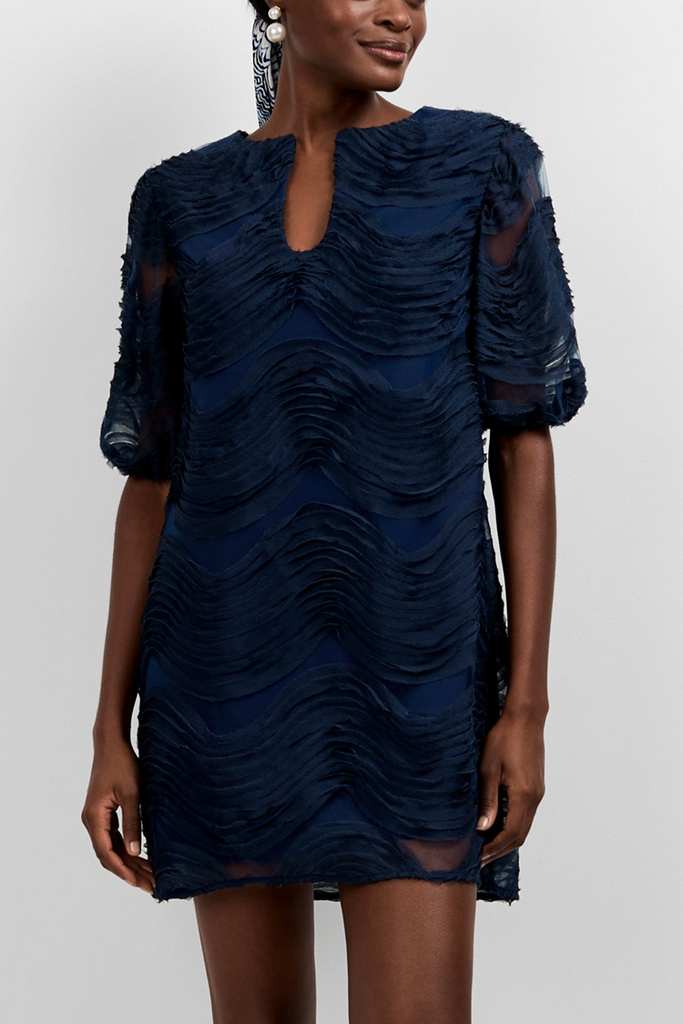 This airy mini dress is made of lightweight mesh organza detailed by soft chiffon waves. It features a notch neck with a keyhole shape and short bubble sleeves that add a flirty element to the refined design.