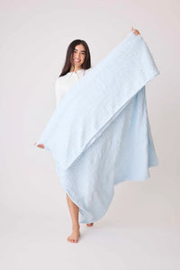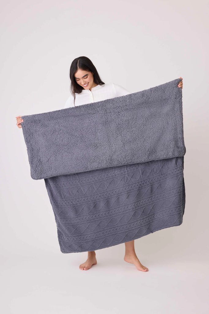 Wrap yourself in luxury with the chenille cable blanket, featuring a reversible design with cozy faux sherpa fur. This blend of elegant chenille cable and soft sherpa perfectly combines style and warmth, ensuring you stay snug and chic. The blanket comes with a travel carrying case and is ideal for adding a touch of luxury to any space.