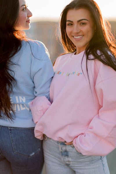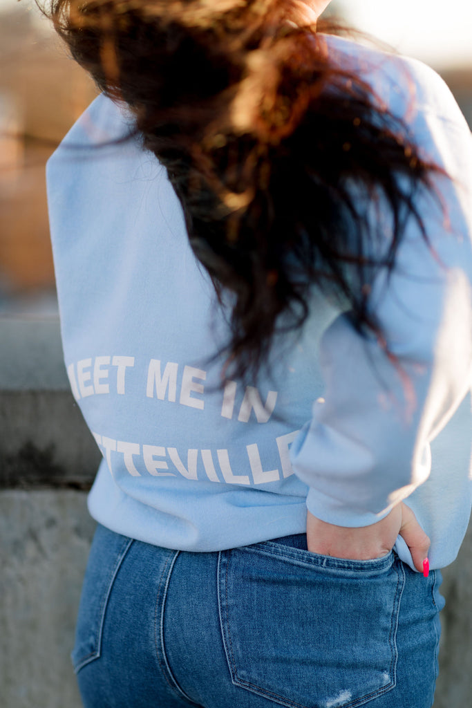 Light blue crewneck sweatshirt from our in-house exclusive brand Meet me in Fayetteville