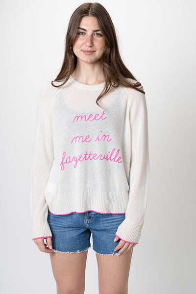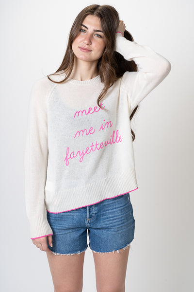 Introducing our new favorite sweater for all our Fayetteville locals. This cream cashmere with fuchsia embroidery is the perfect sweater for your farmer's market Saturday's, Razorback games, or just to throw to run errands. It also makes a great gift. Pair it with your favorite cutoffs and sneakers to complete the look.
