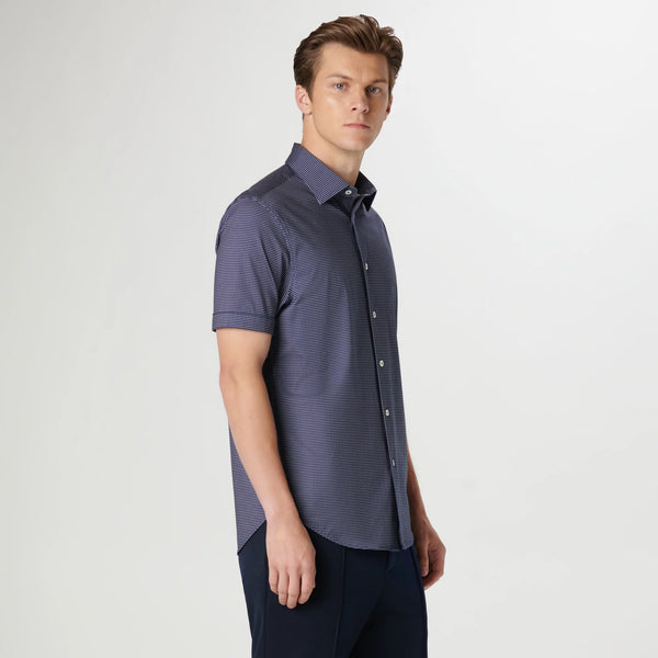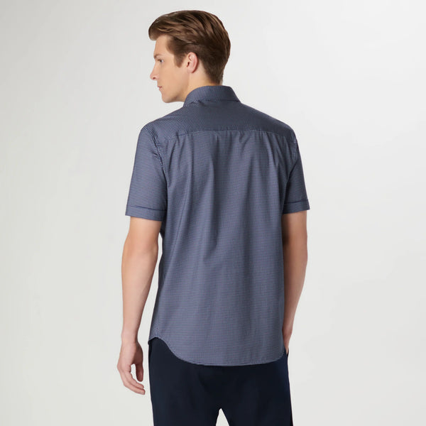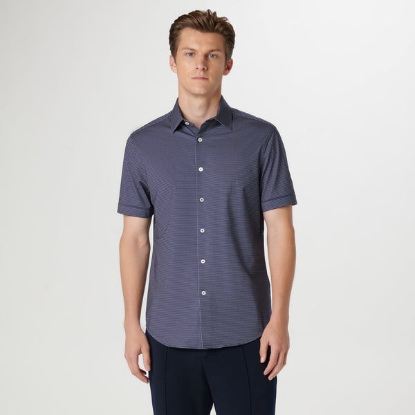 The Miles short-sleeved shirt features a pin dot print on OoohCotton® fabric, a point collar, genuine shell buttons, and a curved hem. OoohCotton® is a double-mercerized, wrinkle-resistant, breathable, and easy-care cotton blend with 8-way stretch, quick-dry, and thermal comfort properties.