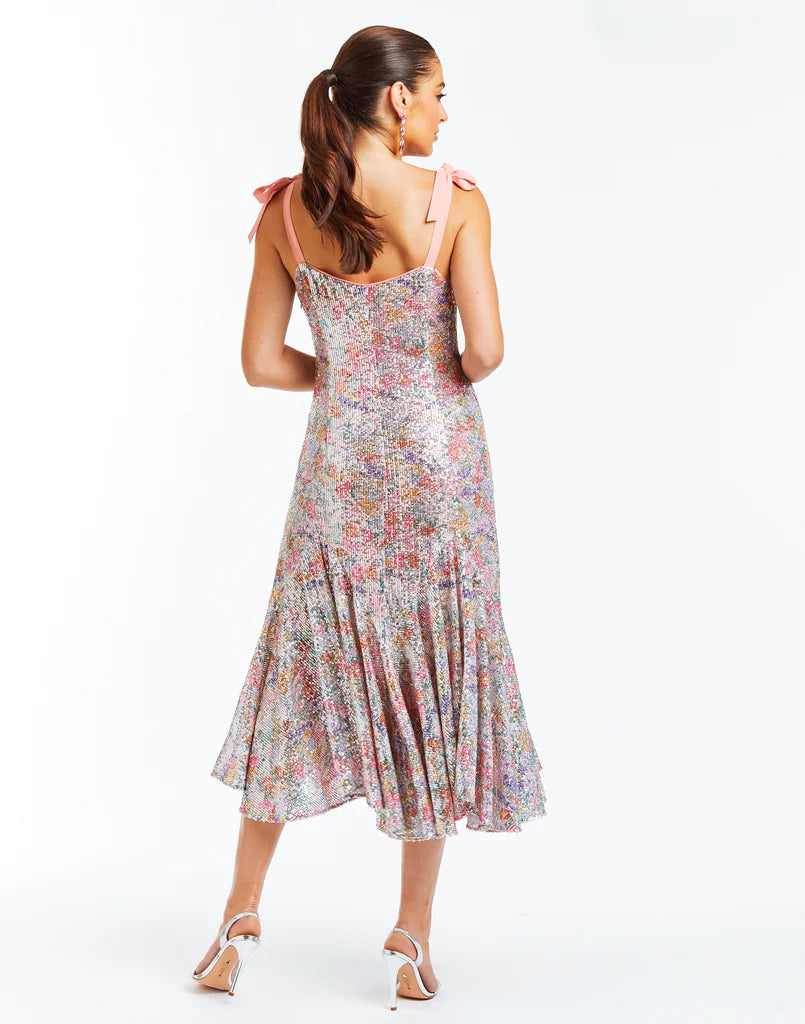 • Sleeveless midi dress in sequin with ruffle skirt godets