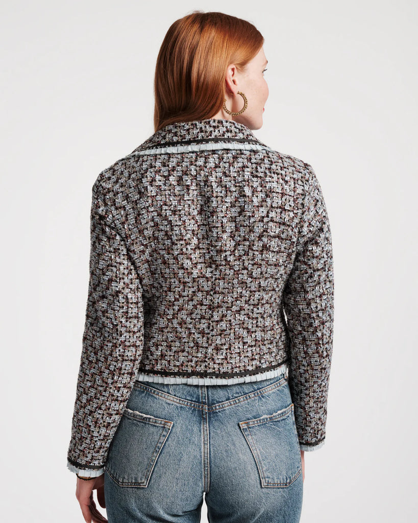 The Jessie Jacket gives classic tweed a rebellious twist. Cut in a cropped silhouette from gold-flecked deco tweed in light blue and brown boucle, it’s finished with sharp contrast ruffle-fringe trim for a final flourish. With its tailored structure, besom pockets, and single hook-and-eye closure, Jessie strikes the balance between polished prep and unexpected edge. Wear it with denim for off-duty cool or over the matching dress for a statement set.