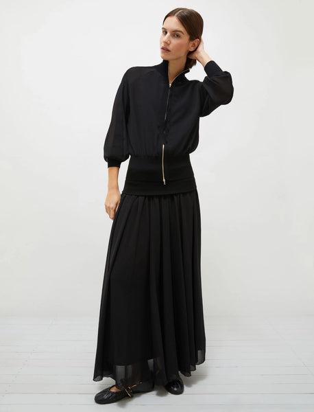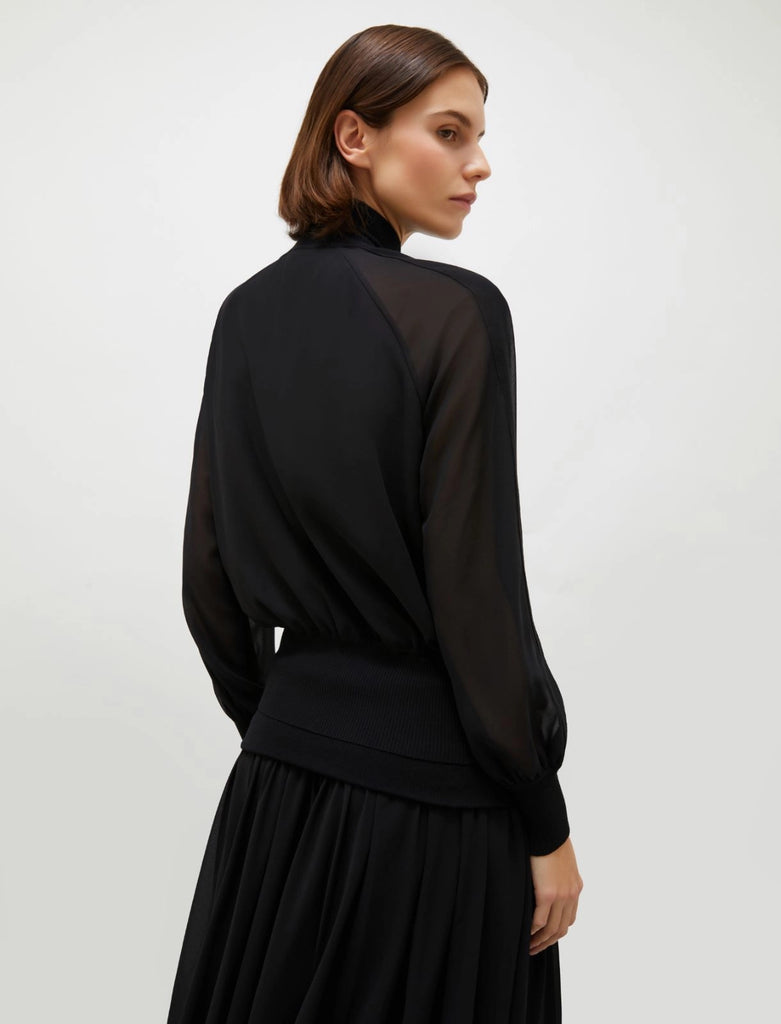 This georgette blouson jacket with tone-on-tone knitted details is set apart by its sheerness and comfy-chic details. Pair it with a flowing skirt or jeans for a relaxed city look.
