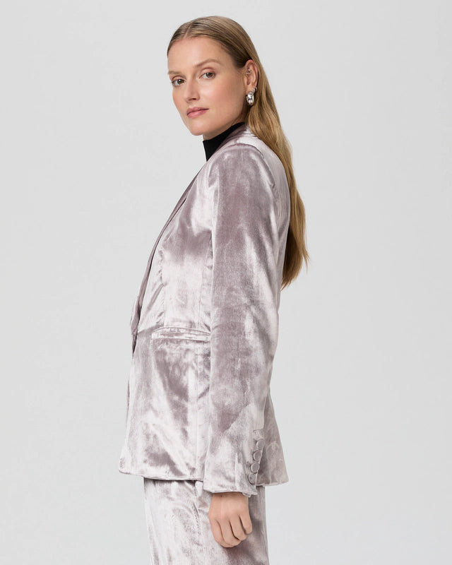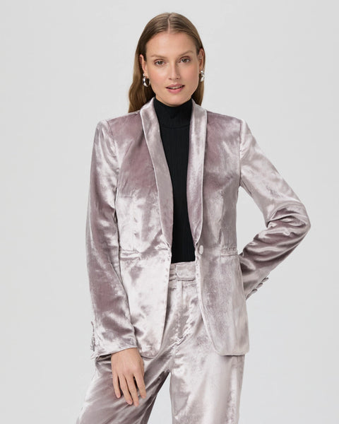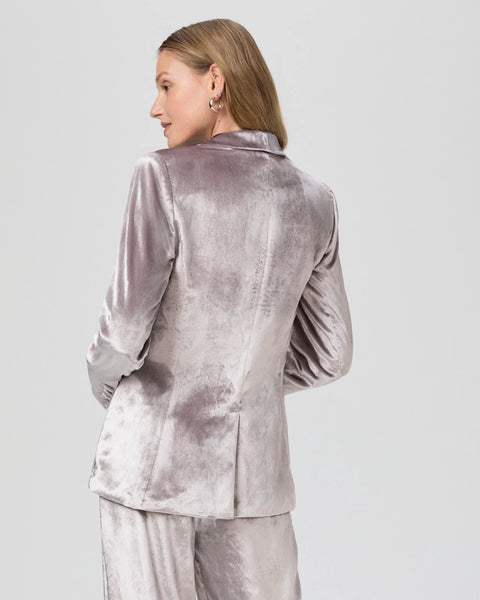 The Kriselle Blazer is the elevated must-have piece of the season for your next special occasion. Crafted from luxuriously soft icy grey high shine drapey velvet, this luxe jacket features a shawl collar, welt pockets, and a self-covered button. Pair the Kriselle Blazer with the coordinating Chateau Pant for a chic matching moment.
