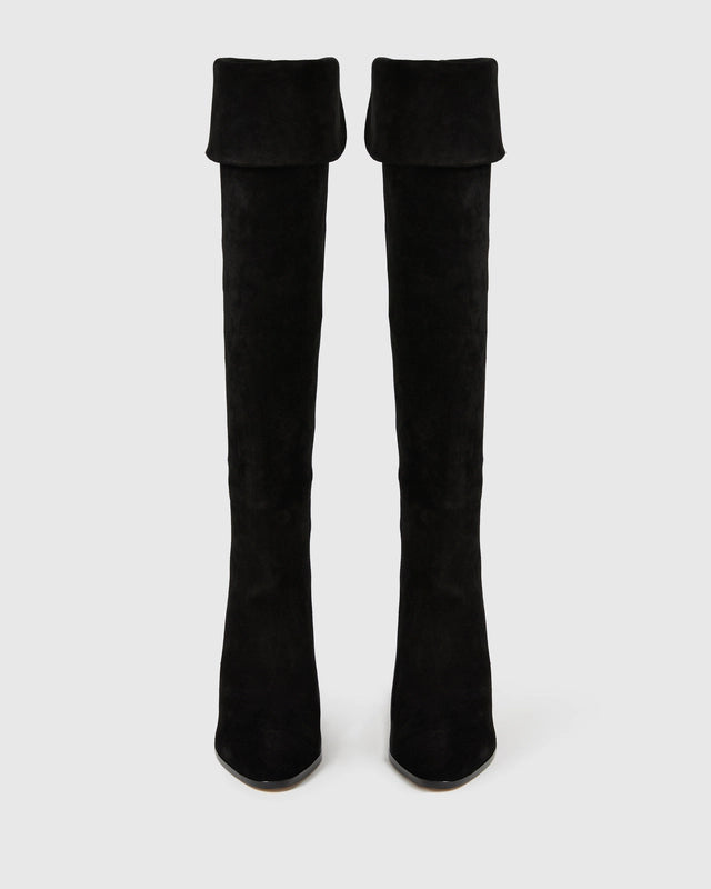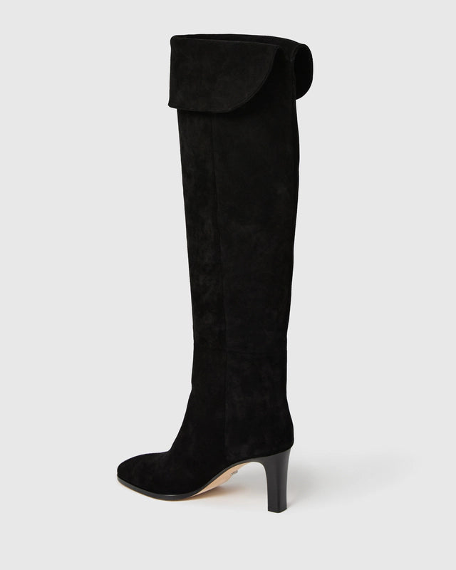 Paige's sleek and versatile high-heel boot designed for effortless sophistication. crafted from luxuriously soft black suede, this tall boot can be worn over the knee or folded down below the knee for versatility. Chiara features a soft almond tie with a subtle leather welt detail, while the black leather stacked sculptural stiletto heel adds a strong, elegant finish.