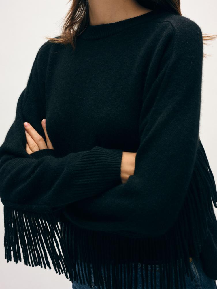A crewneck defined by movement and texture. Spun from a plush wool–cashmere blend, this luxury sweater features hand-applied fringe, finely cut along the arms and back. Size up for an oversized look.