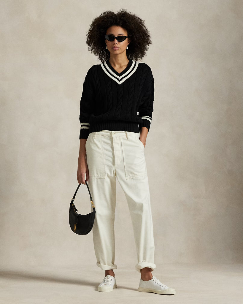Inspired by the classic cricket sweater—and enduring Polo staple—this season’s version is Aran-knit with cotton for soft texture and features contrast stripes at the neckline, cuffs, and hem.