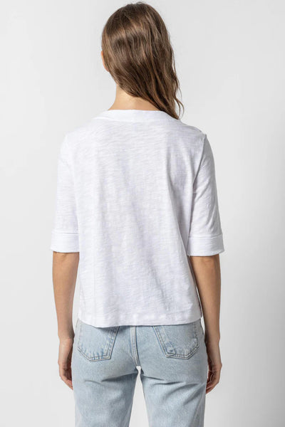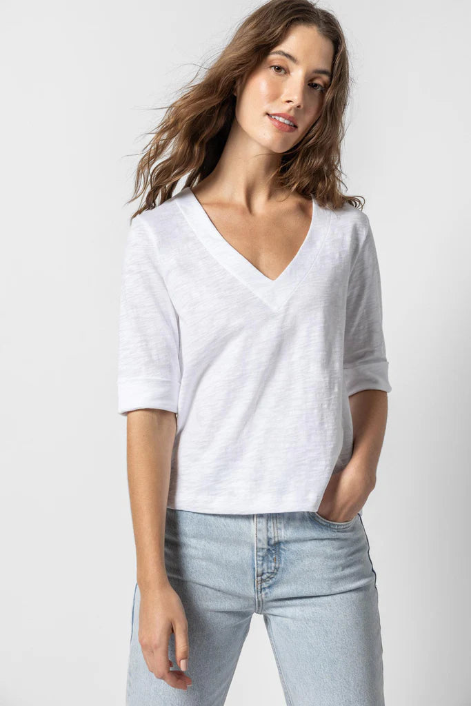 Lilla P Cuffed Elbow Slv V Neck Tee-White