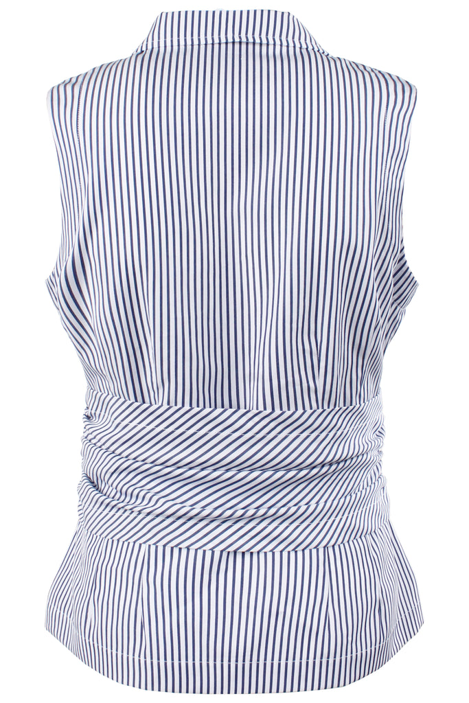 • Blue and white wrap tie front sleeveless shirt with hidden front button placket