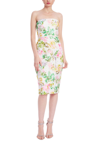 The strapless design of this dress features a sleek, no-fuss neckline. It seamlessly leads into a body-hugging silhouette that promises to trace your curves with precision, thanks to its lace fabric bursting with vivid floral prints. At the waist, a fabric knotted belt cinches in, injecting a dose of modern chic while defining your silhouette with an extra flair.