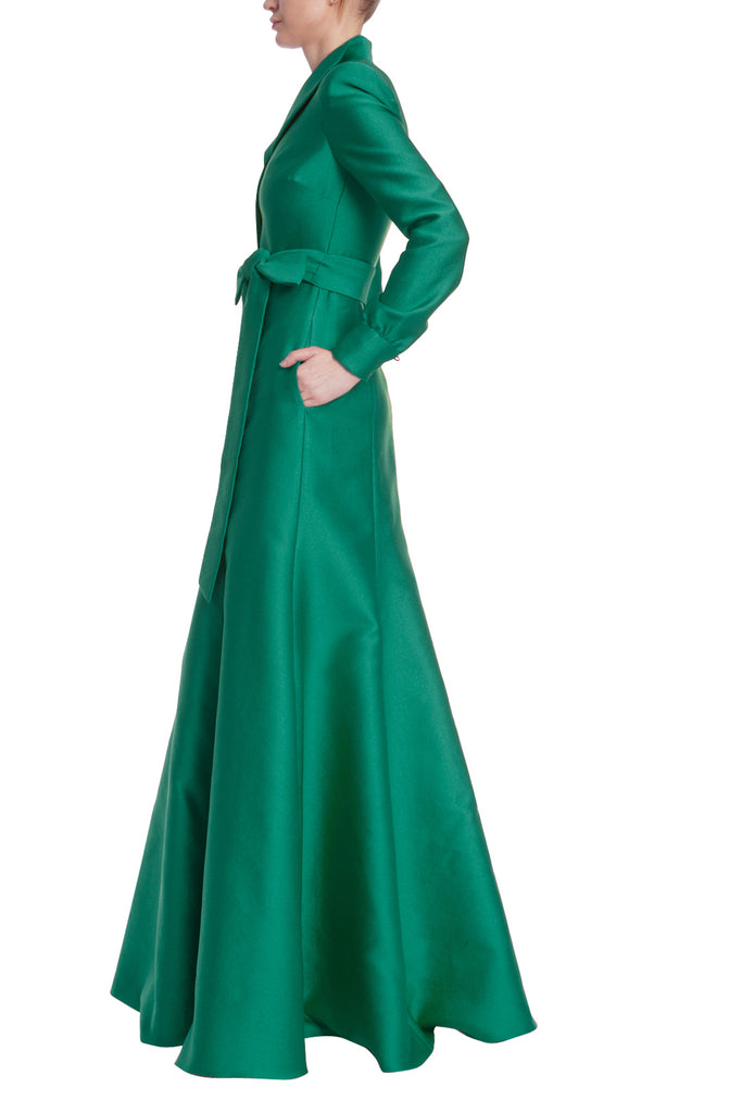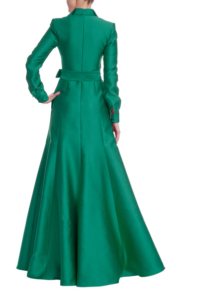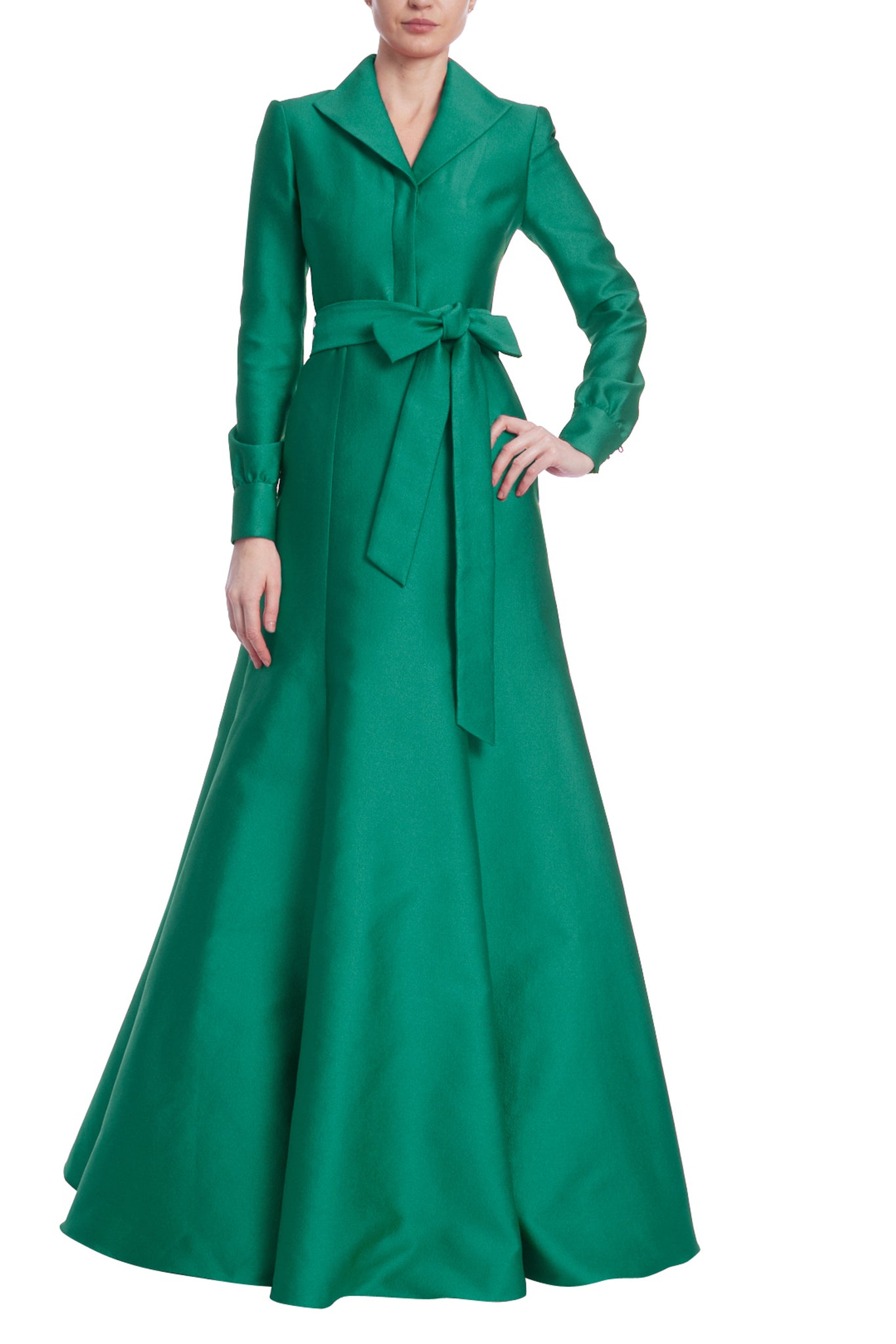 This gem is made from a lightweight pebble crepe with a concealed front closure to ensure sleek, uninterrupted lines. The fitted bodice cinches at the waist with a wide, bow-tied sash that sets the stage for the stunning A-line skirt below that flows stunningly to the floor. A notched lapel collar paired with a modest V-neckline adds a dash of formality, and long, tailored sleeves with subtle buttons at the cuffs complete the polished look. This dress is a darker green than portrayed in the photo.