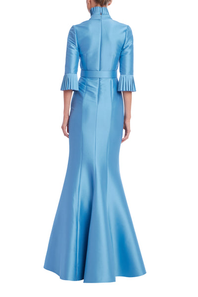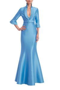 Stretch Mikado fabric gives this dress its sculpted, cinched-in silhouette, flowing beautifully into a floor-sweeping mermaid hem. The deep-plunging neckline commands attention, while the elbow sleeve adds balance—both elements tied together by a bold ruffled trim for a polished-meets-powerful finish. A matching belt pulls everything in at the waist, emphasizing that hourglass shape.