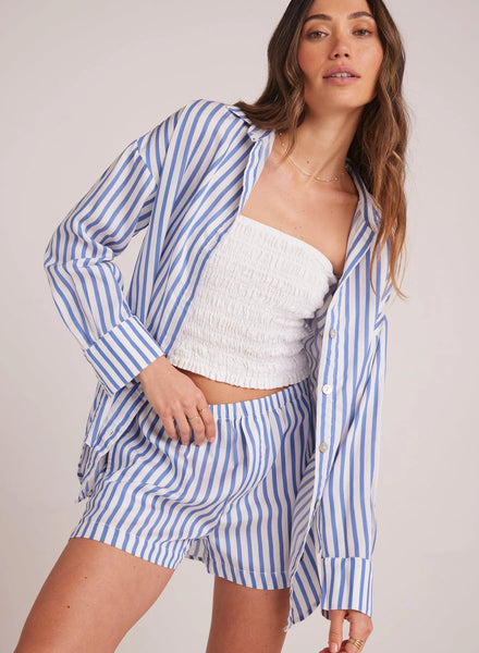 Introducing Bella Dahl's latest Boyfriend striped shirt. This button-down, long sleeve shirt is perfect for the spring and summer season, offering a trendy and sophisticated look. Made from a soft and cool fabric, it ensures comfort throughout the day.