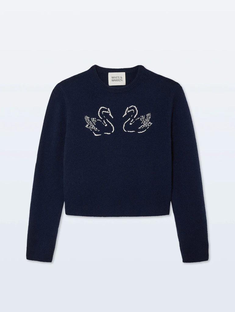 White and Warren Cashmere Blend Embroidered Swan Sweater