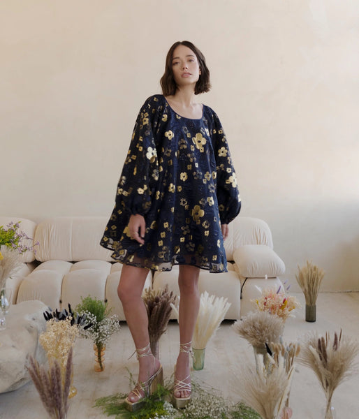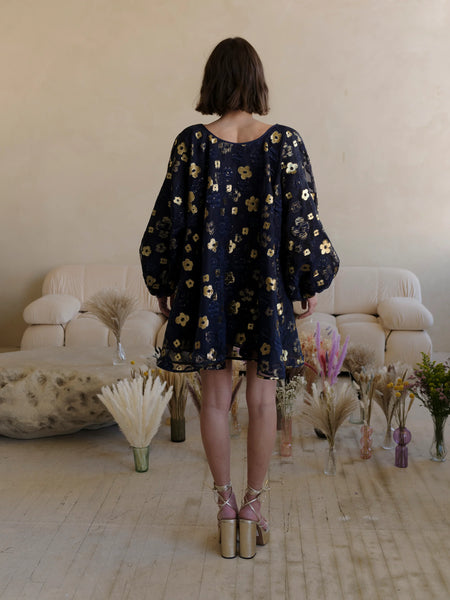 A flirty take on our iconic good luck dress! Beautiful flowy relaxed fit with embroidered gold and midnight blue flowers. Features 2 layers of fabric including a silk lining and elastic at wrists.