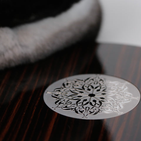 The elegant glass vessel is embellished with our signature emblem, adding a touch of luxury to any living space. The signature cap is handcrafted using ebony Madagascar wood and features a Thompson Ferrier medallion at the center, adding a touch of elegance and luxury. The cap is finished with 17 layers of lacquer and a sanding process after every layer to ensure a flawless mirrored look.