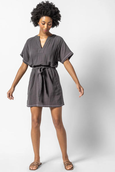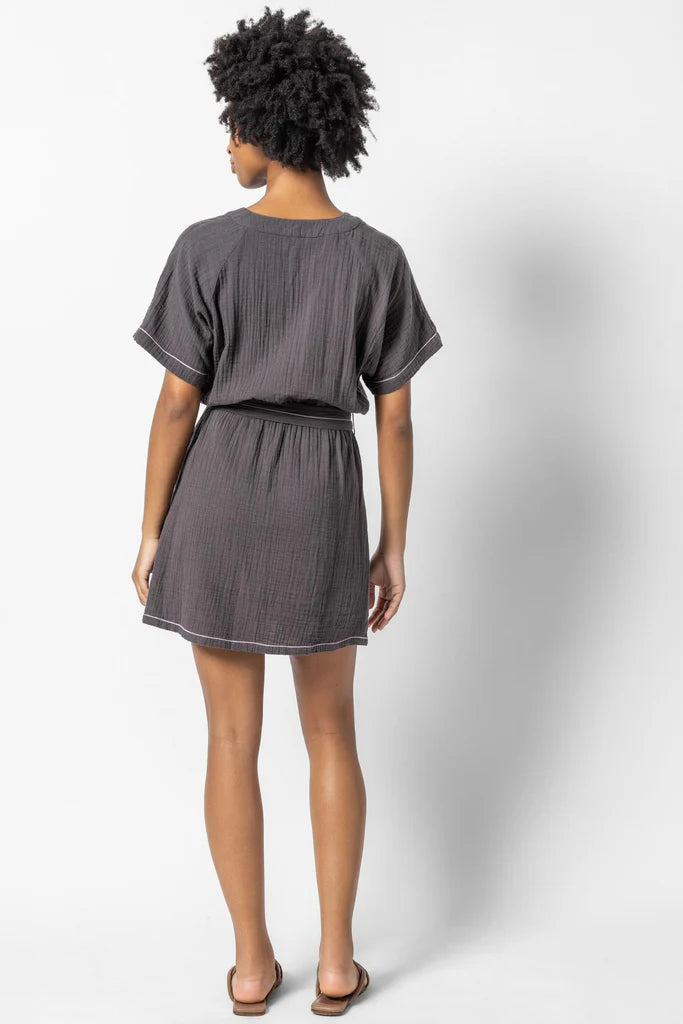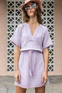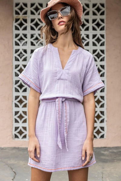 This cotton double gauze fabric, this throw-on dress has the perfect amount of sleeve coverage, an elastic waist, and a belt for shape. The contrasting color stitching adds extra detail to this great summer dress.