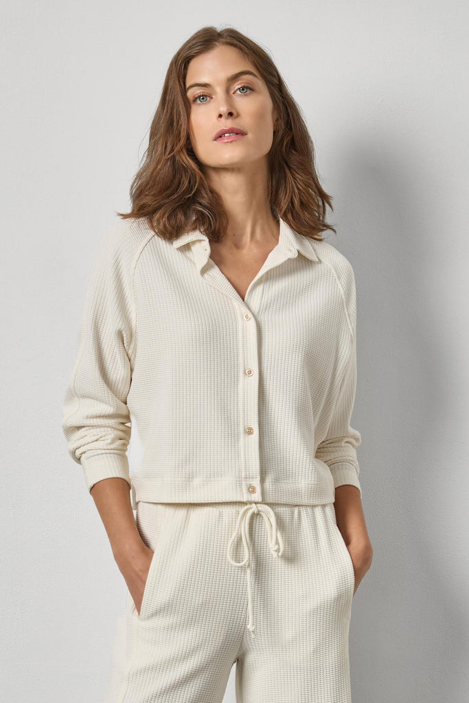 Easy Raglan Button Down in Textured Waffle is an update to a best-selling favorite. Designed with low armholes for a relaxed fit, this collared style has a shorter body length and narrows slightly at the hem for a modern, flattering shape. Pair it with the coordinating pant for the perfect set, ready for travel days or running around town.