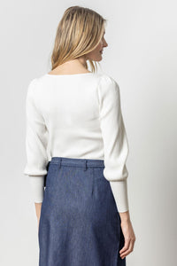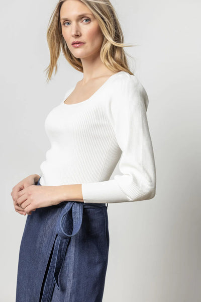 With a soft square neckline and full sleeve, this fitted sweater is perfect for day or night. When a tee is not quite right, these Fine Gauge Stretch Knit pieces are perfect.