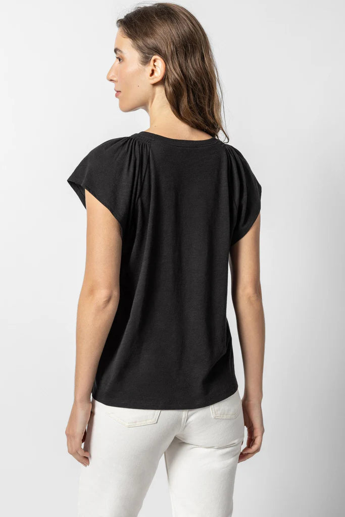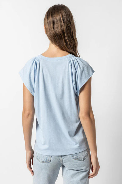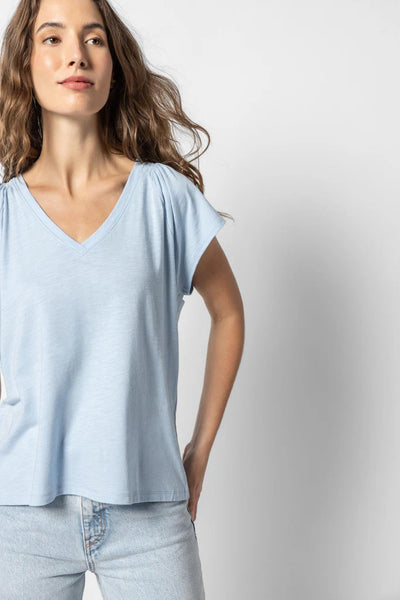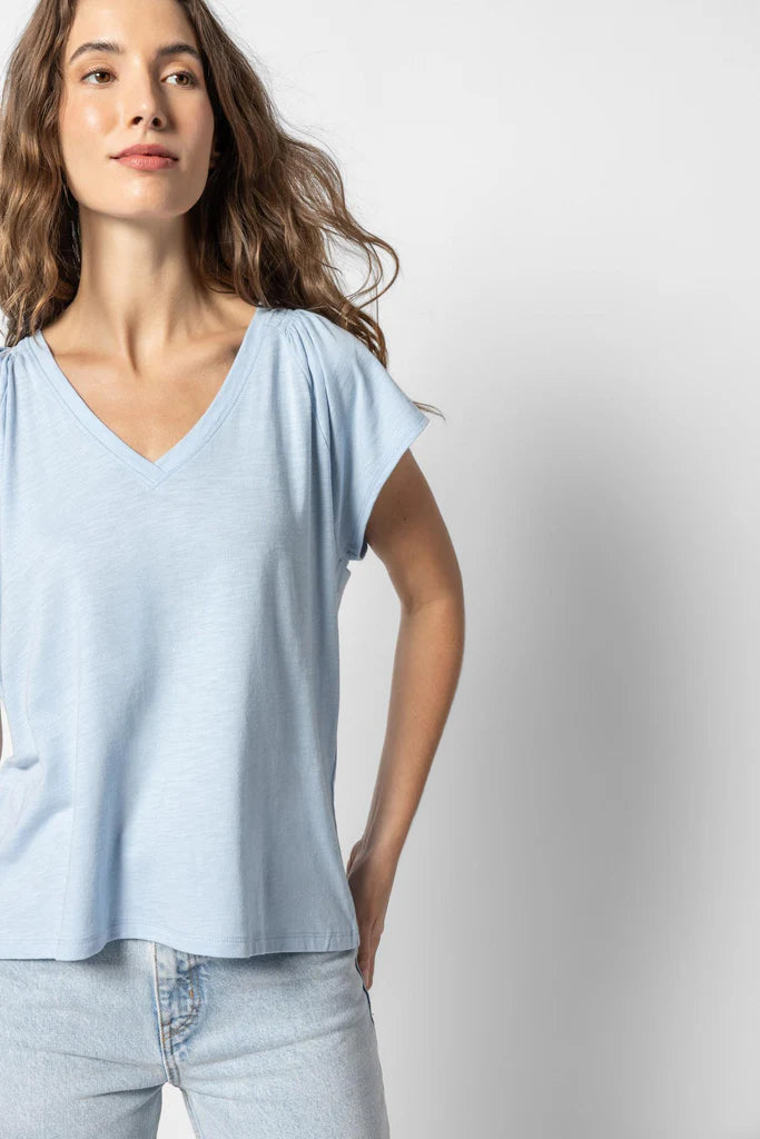 In Lilla P's coveted Flamé Modal fabric, this V-neck tee has a slight flutter sleeve and shirring detail at the neckline. This tee is the epitome of simple - yet anything but basic.