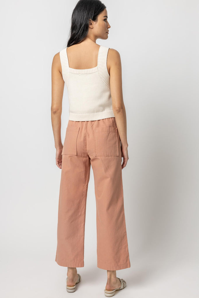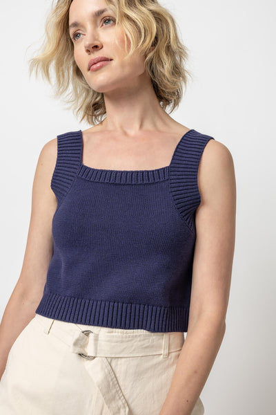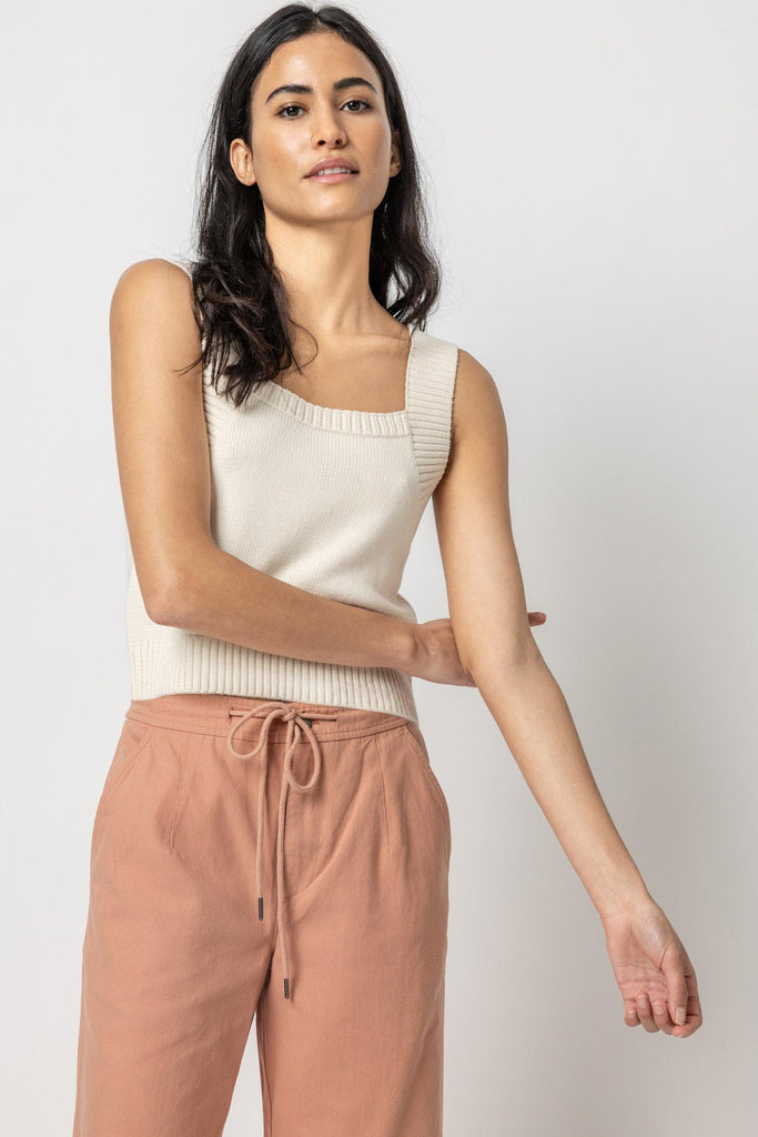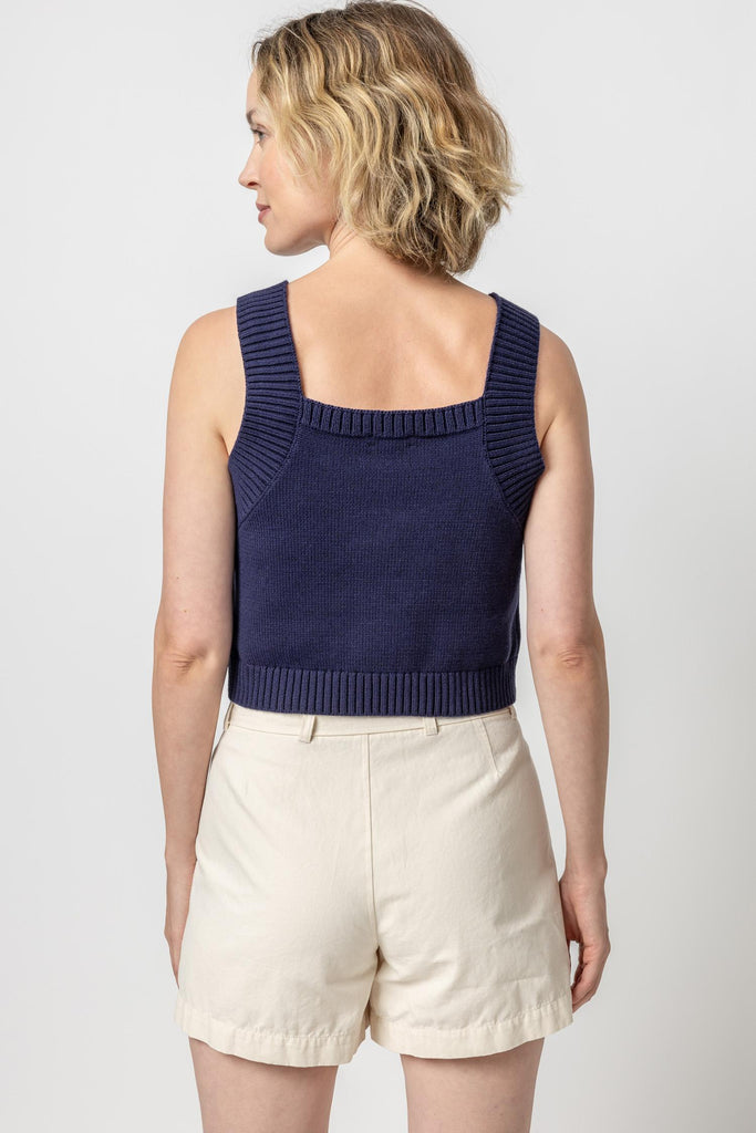 In our mid-weight cotton blend yarn, this sweater tank is a shorter length (but not cropped) and is great worn alone or under a jacket.