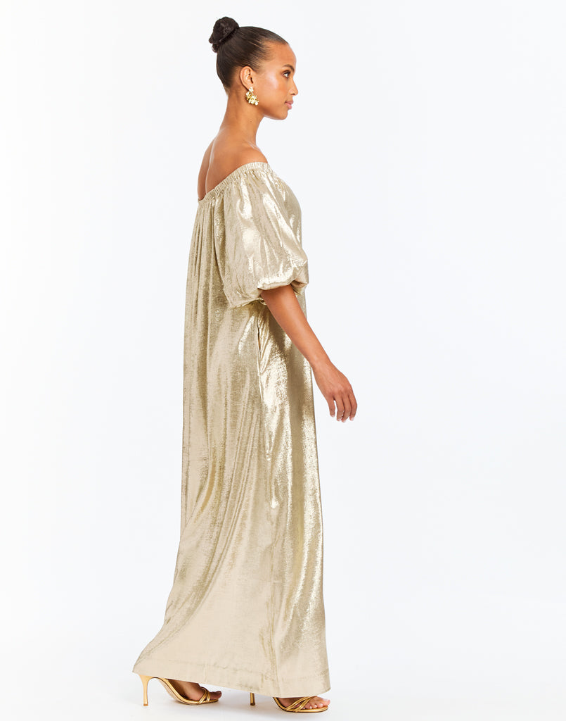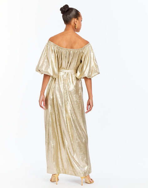 • Maxi length evening dress featuring a off the shoulder neckline