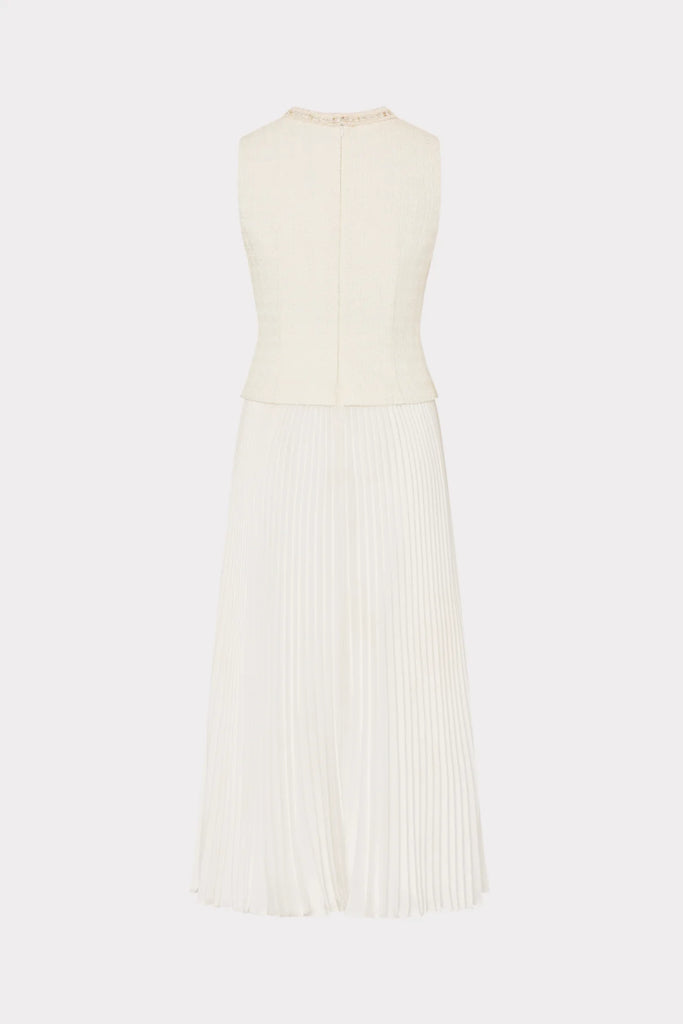 This mixed media dress style combines a tailored Bouclé bodice and an elegant, pleated chiffon skirt to create the appearance of two separate pieces. It’s accented with faux buttons and pocket details.