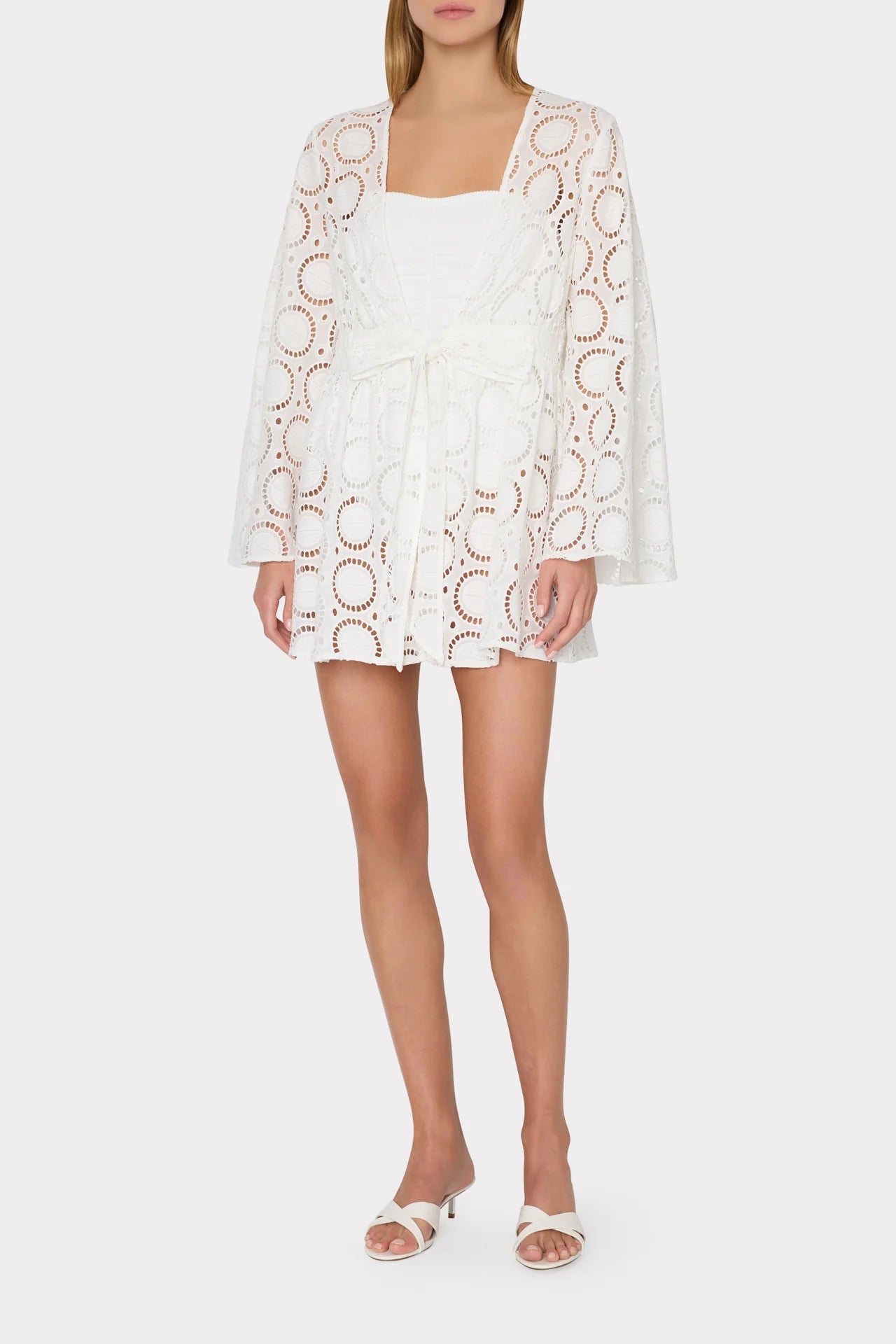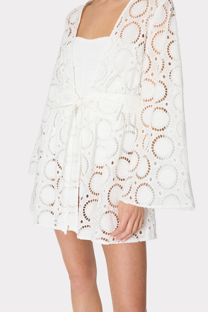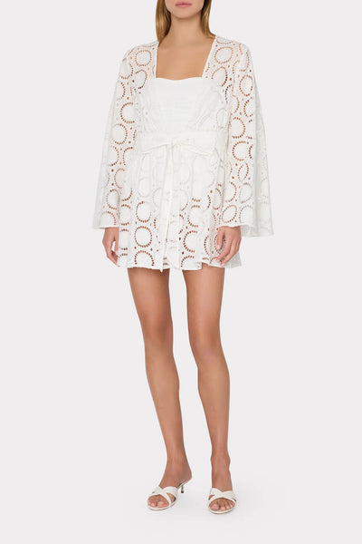 This 100% cotton mini cover-up dress is crafted from our Geo Eyelet fabric. It has long, dramatic sleeves, elastic at the waist, and is made to be worn open with a tie in front.