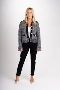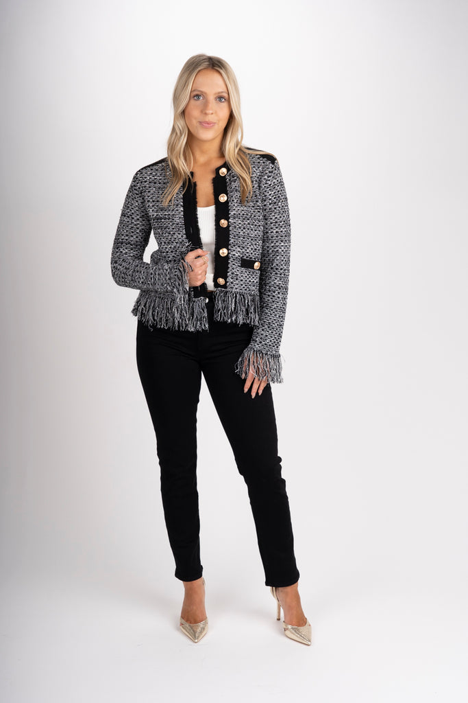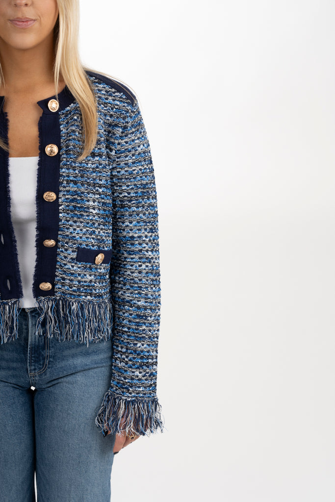 The iconic cardigan jacket gets a new twist this season with fun, fringe detailing and stripes that lends a polished touch. The intricate gold buttons can be fastened or worn undone.