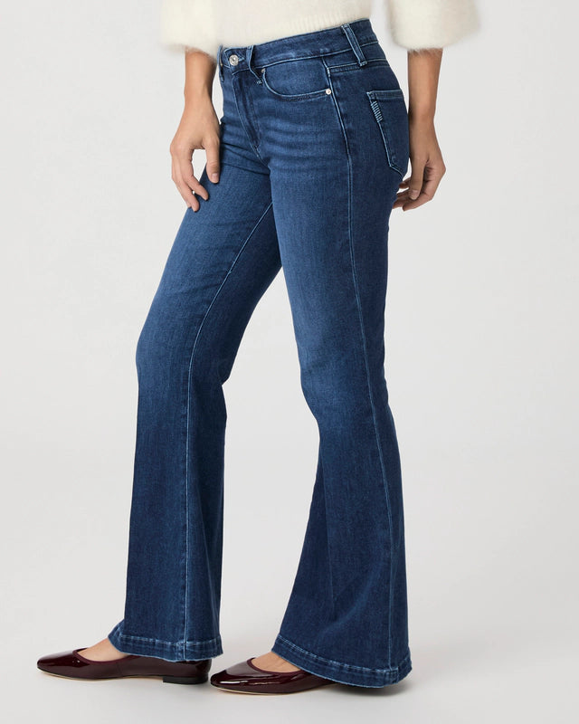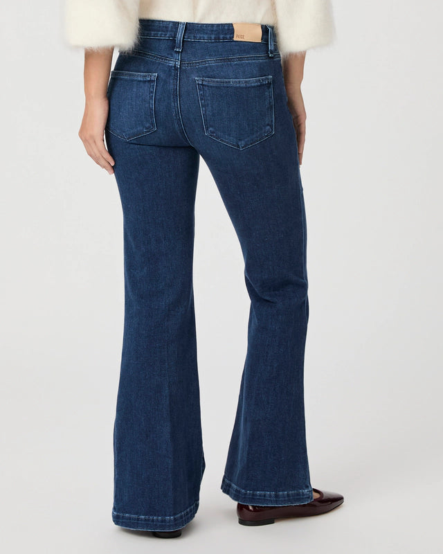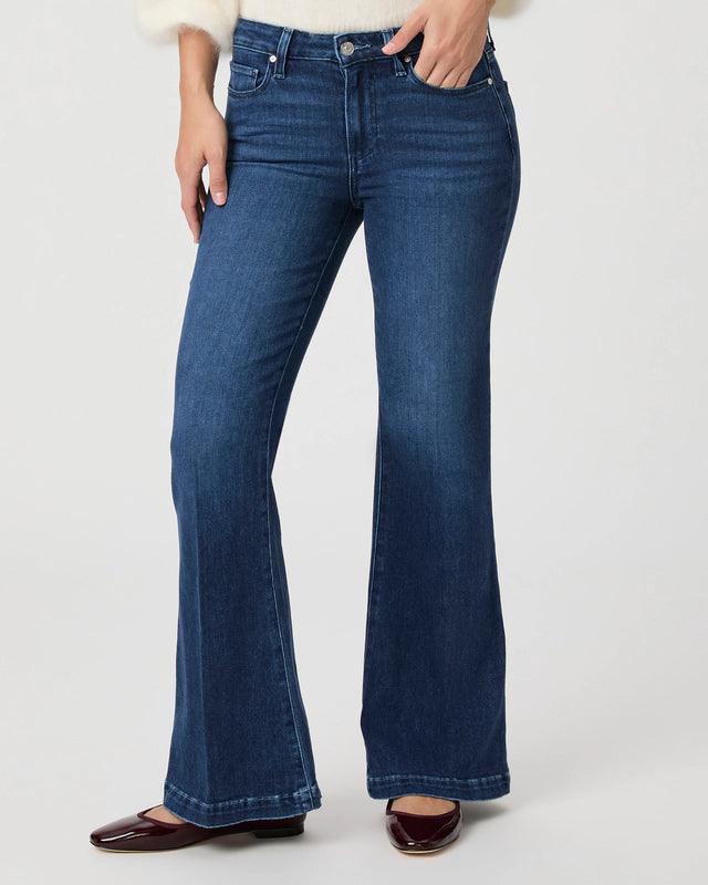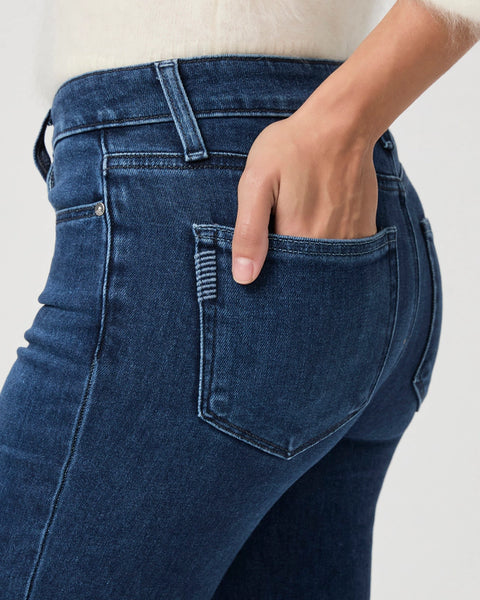 Genevieve is the perfect vintage-inspired, high-rise flare silhouette that gives your legs a long, lean look. This pair has a 32" inseam that’s perfect to wear with flats or for petite customers looking to style it with a heel. Cut from Paige's TRANSCEND VINTAGE denim in a bright dark wash with tonal thread, this pair has the look of authentic vintage denim but is incredibly comfortable with plenty of stretch and recovery.