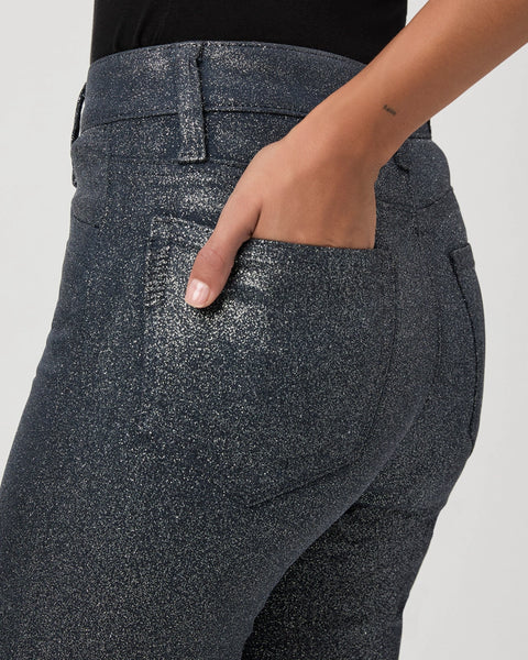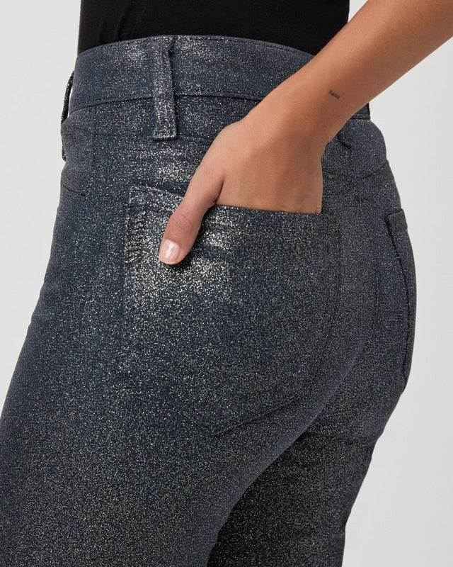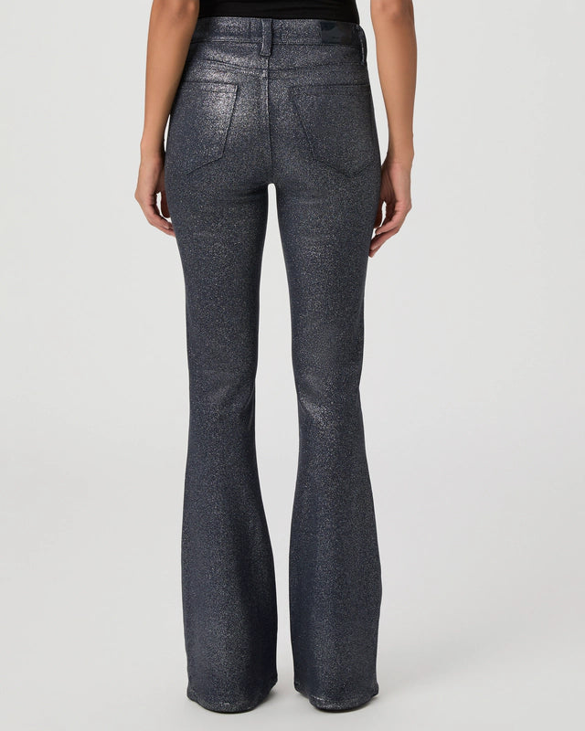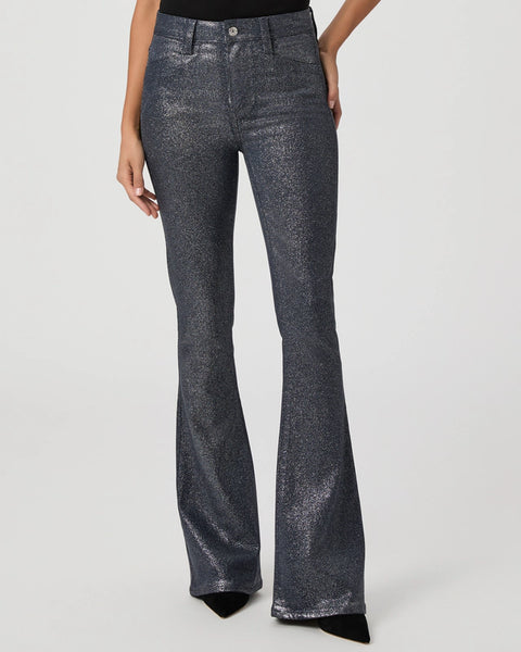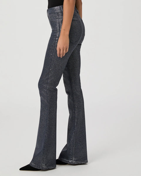 An elevated addition to your wardrobe, this high-waisted flare is fitted through the thigh and kicks out at the knee, creating an elongating silhouette. This on-trend style has a glittery, leather-like look, but doesn’t sacrifice comfort. Cut from coated TRANSCEND denim in navy and silver shimmer, this style is luxuriously soft with plenty of stretch and recovery to give it a fit that shines all day and night.