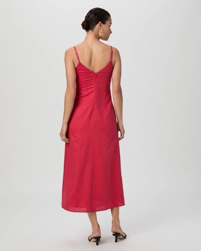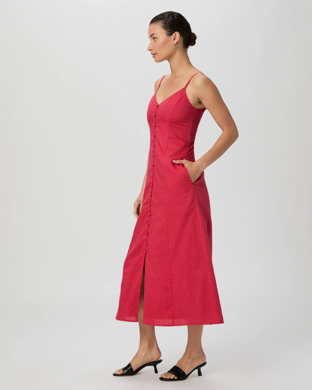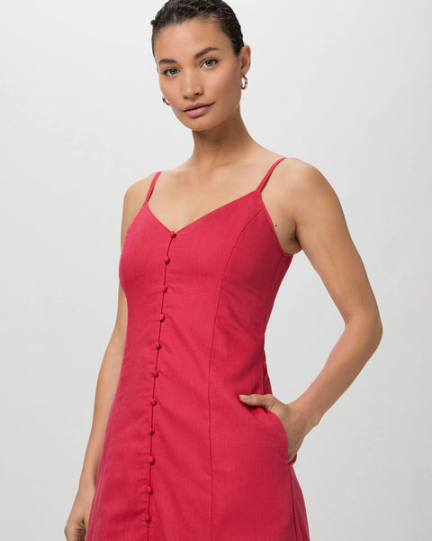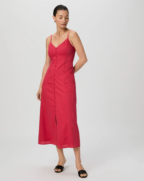This sleeveless maxi dress features a streamlined silhouette with a flattering v-neckline, princess seams down the front, and covered buttons. Made from a lightweight cotton/linen blend in a bright red shade, this feminine maxi dress is perfect for any warm-weather outing.
