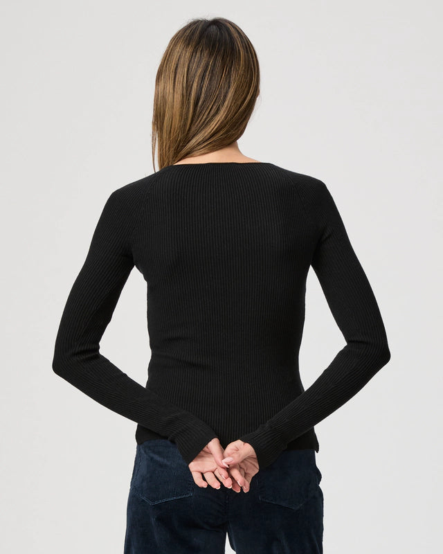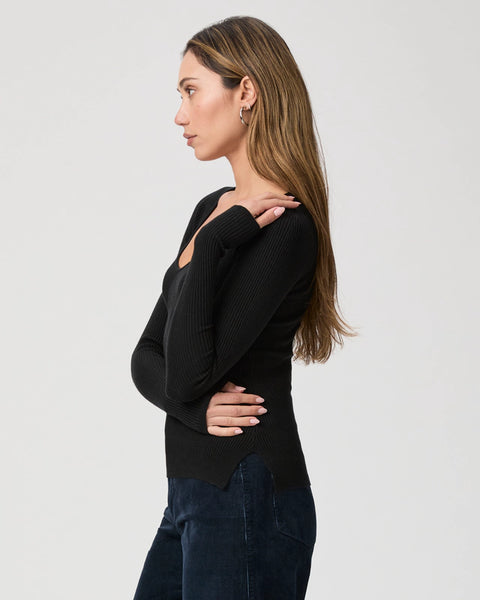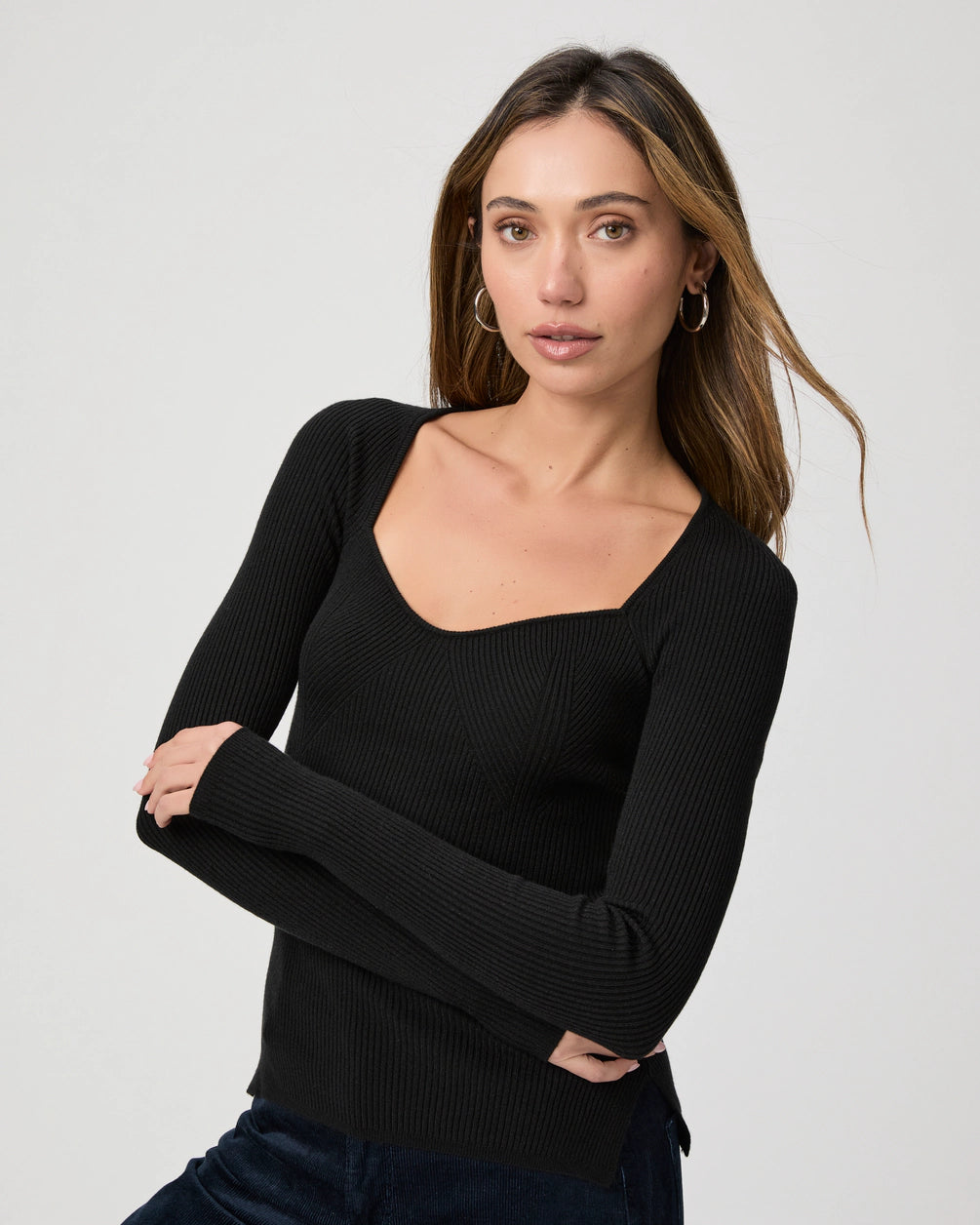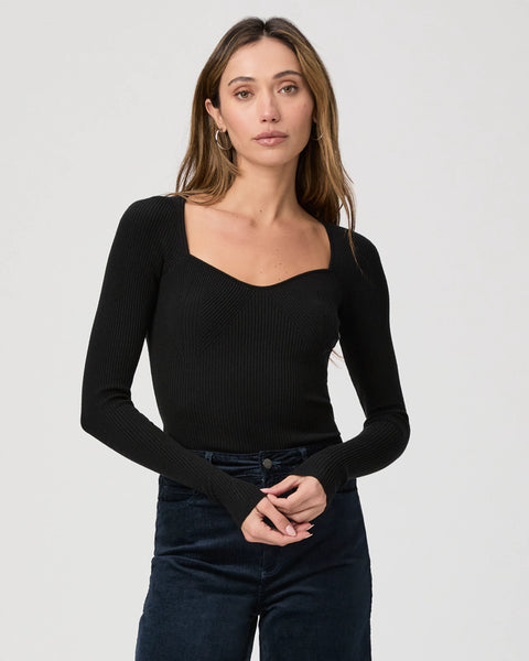 This long sleeve top is made from an incredibly soft and comfortable black ribbed knit material with a flattering contour stitch detail throughout and a sweetheart neckline. The Parvati Top looks great tucked into any shade of denim.