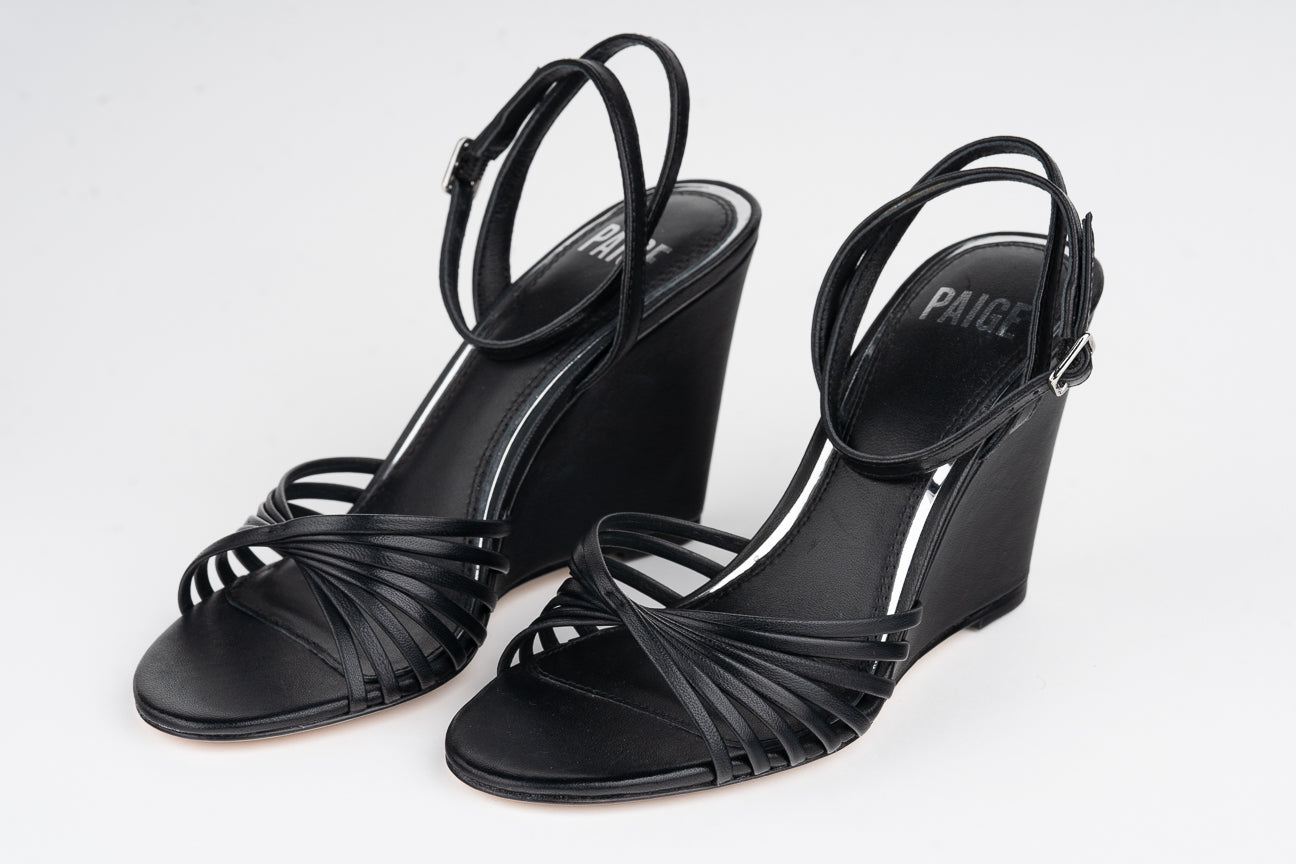 Slender straps fan elegantly across the toe of this ankle-wrap sandal perched on a sculpted wedge heel.