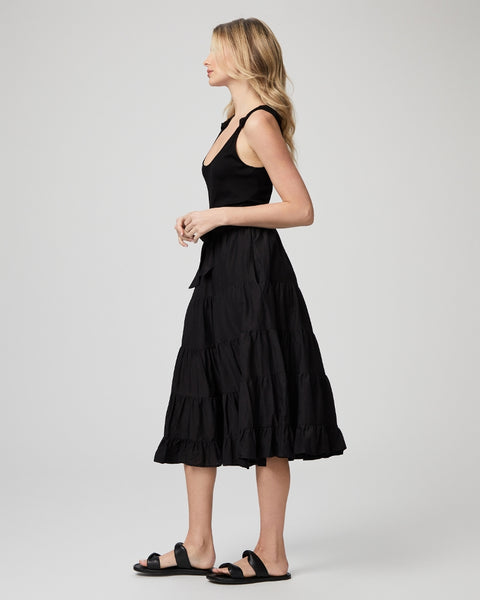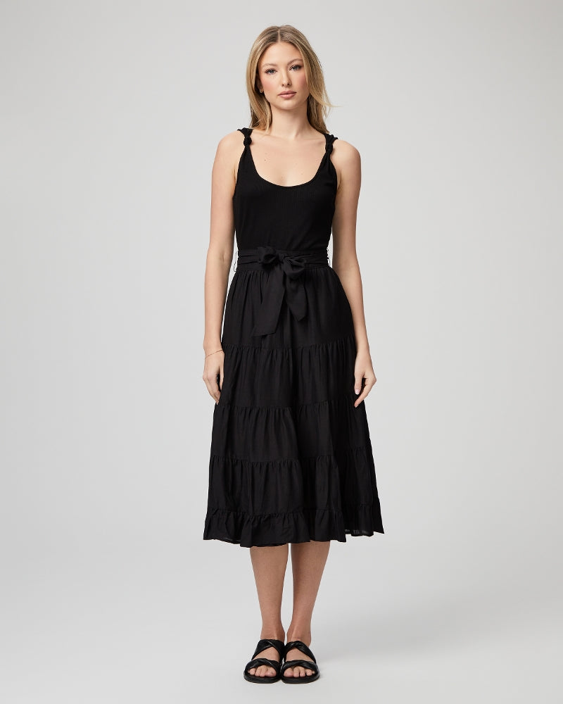 Effortless yet chic, this timeless black midi dress is made from our super soft ribbed knit material with knotted details at the straps, a flattering self-tie at the waistband, lining to the mid-thigh, and a tiered skirt made from a light and airy cotton blend. The Samosa Dress will be the go-to for your next special occasion.