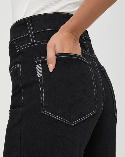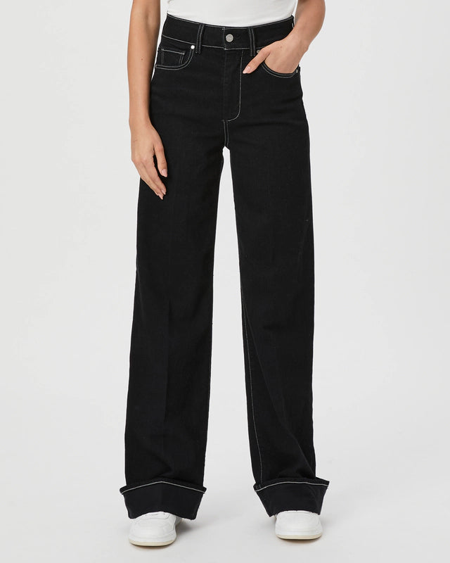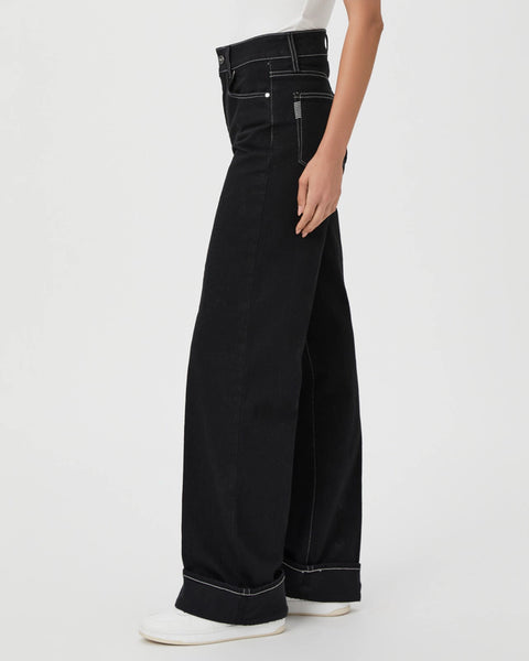 Sasha is a high-rise wide leg with a fitted top block and a slightly relaxed fit. This pair is cut from PAIGE VINTAGE denim in a rich black wash with white contrast stitching, a wide tacked cuffed hem, and a 32" inseam. PAIGE VINTAGE takes all of the work out of breaking in your favorite pair of vintage jeans.