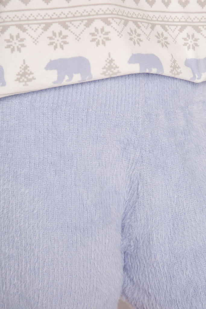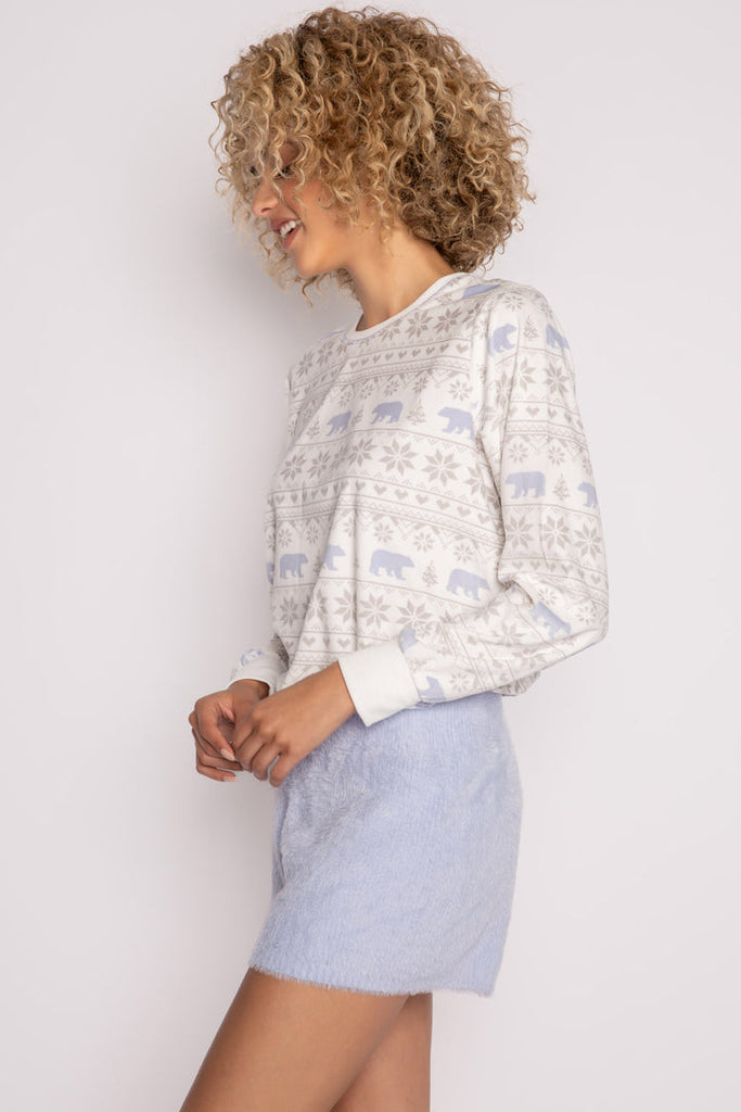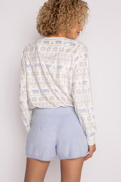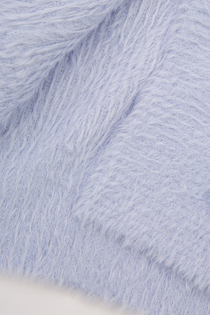 A sweet sweater knit lounge short with ribbed knit waist paired with the perfect V-neck sweater tank. A fun way to add a little cozy to your mix on chilly nights. The perfect perfect layer with a matching cardigan, or a luxe evening look on its own, in beautiful icy blue feather knit. The set includes the tank and matching shorts only. Other designs pictured are sold seperately.